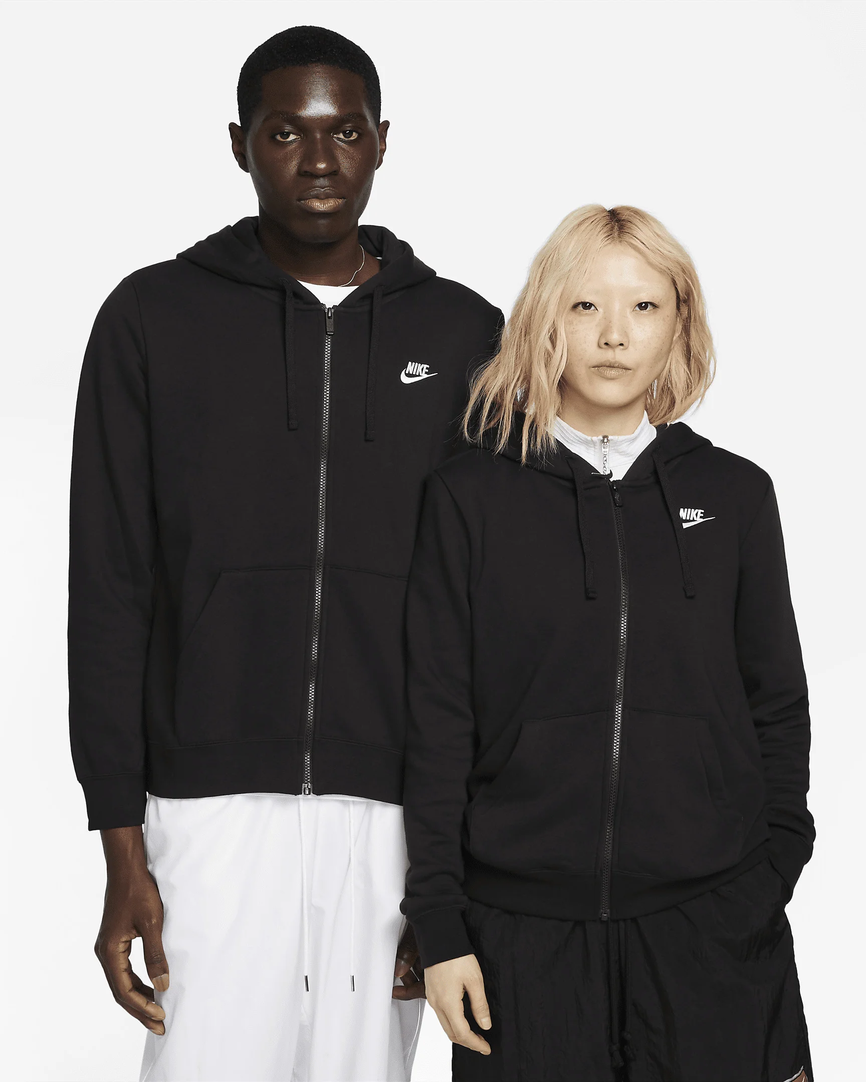 Club Fleece sweatshirts, universally loved for their coziness and consistency, are for everyone. Always soft and made with a relaxed fit, they’re basics that help you do more. This full-zip option allows you to regulate your temp on the fly. Zip it up when the wind is howling or leave it open to show off your favorite tees and tops. Benefits - Our best-selling fleece for a reason, Club Fleece has a cozy, familiar feel and consistent fit you can return to again and again. Brushed for added warmth and softness, it’s an ideal layer for colder temperatures. - Ribbing at the hem and cuffs is soft and stretchy for easy layering. - Jersey-lined 3-panel hood feels soft and smooth. Product Details - Body: 80% cotton/20% polyester. Hood Lining: 100% cotton. - Embroidered Futura logo - Flat drawcord - Front pocket - Machine wash - Imported - Shown: Black/White - Style: DQ5471-010 SIZE & FIT Female model is wearing size XS and is 5'6"168cm Male model is wearing size XL and is 6'1"185cm Standard fit: easy and traditional