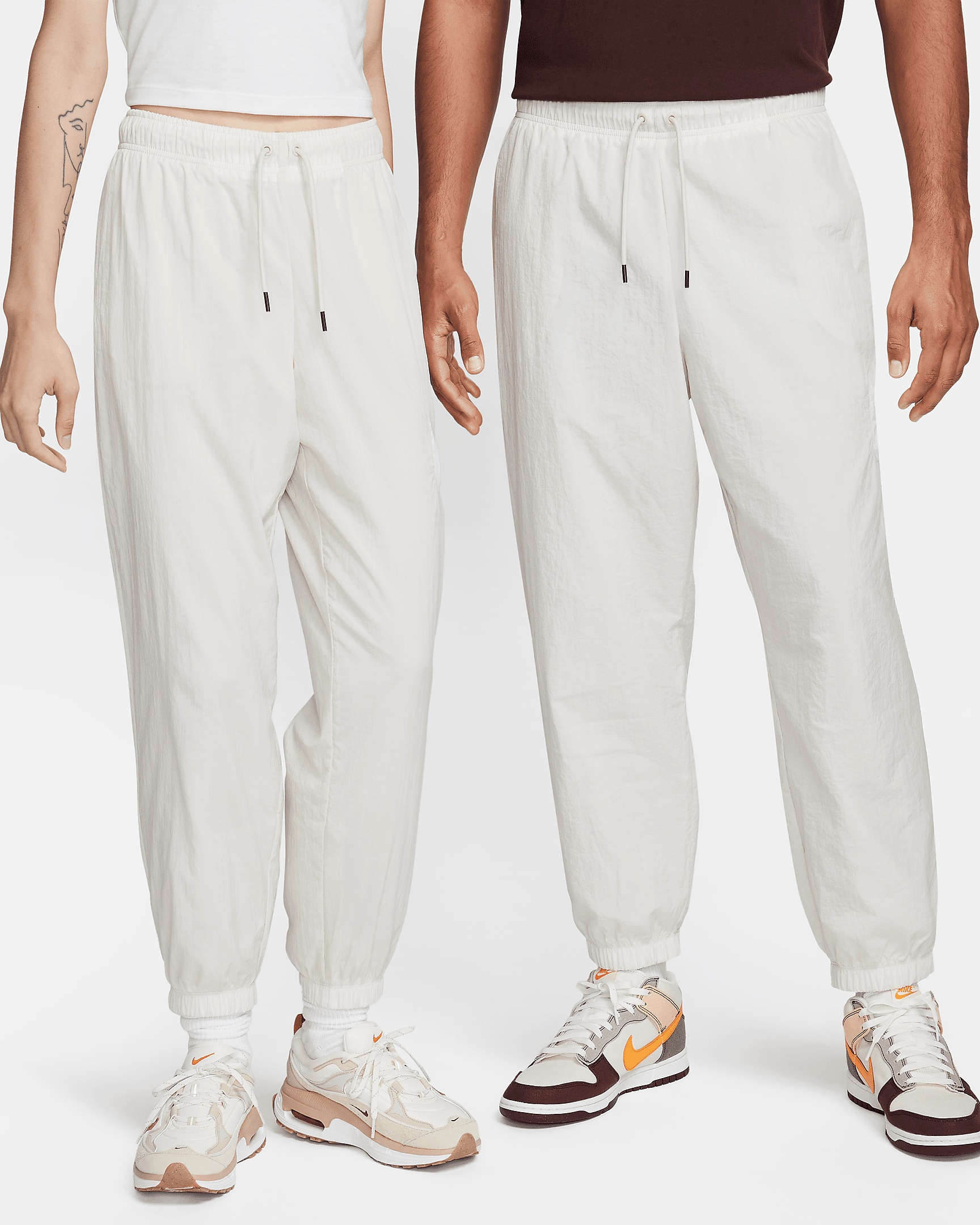 Made with a lightweight, recycled crinkle woven fabric and a roomy fit, these pants are all about comfort. An inset Swoosh logo on the leg provides a signature Nike look ready to pair with your favorite sneakers. This product is made with 100% recycled polyester and recycled nylon fibers. Benefits - Lightweight crinkle woven fabric feels soft and is made from recycled materials. - Side seam pockets provide quick small-item storage. Product Details - Loose fit for a roomy feel - Body: 100% nylon. Lining: 100% polyester. - Mesh lined from waist to knee - Mid-rise - Machine wash - Imported - Shown: Light Orewood Brown/White - Style: DM6183-104 SIZE & FIT Female model is wearing size S and is 5'8"173cm Male model is wearing size M and is 6'1"185cm Loose fit: roomy and relaxed Fl length: hits below ankle Fits large; we recommend ordering a size down