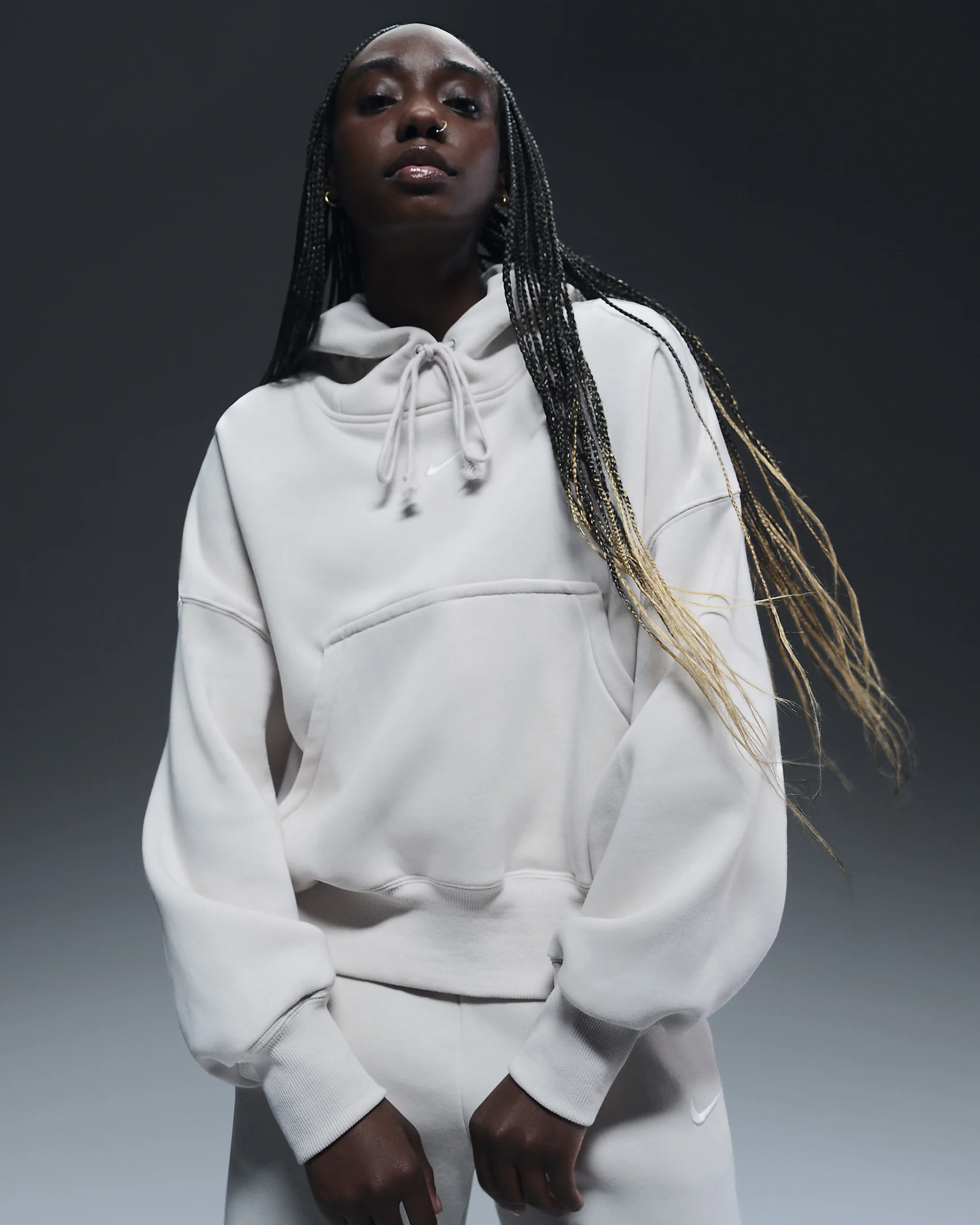 Grounded in style, comfort and versatility, meet our take on luxury loungewear. Our roomiest fit paired with exaggerated details (like the oversized pocket and taller ribbing) ensures this hoodie is anything but basic. All that's left to decide is whether to style it with the matching sweats or other pieces from your wardrobe. Benefits - Our midweight brushed fleece feels extra soft on the inside and smooth on the outside, helping you stay cozy while keeping its structured shape. - Dropped shoulder seams and roomy sleeves provide a relaxed, spacious feel. Product Details - Elongated ribbing - Drawcord hood - Front pocket - Body: 80% Cotton/20% Polyester. Hood lining: 100% Cotton. - Machine wash - Imported - Shown: Light Orewood Brown/Sail - Style: DQ5858-104 SIZE & FIT Model is wearing size S and is 5′9″175cm Oversized fit: exaggerated and spacious Fits large; we recommend ordering a size down