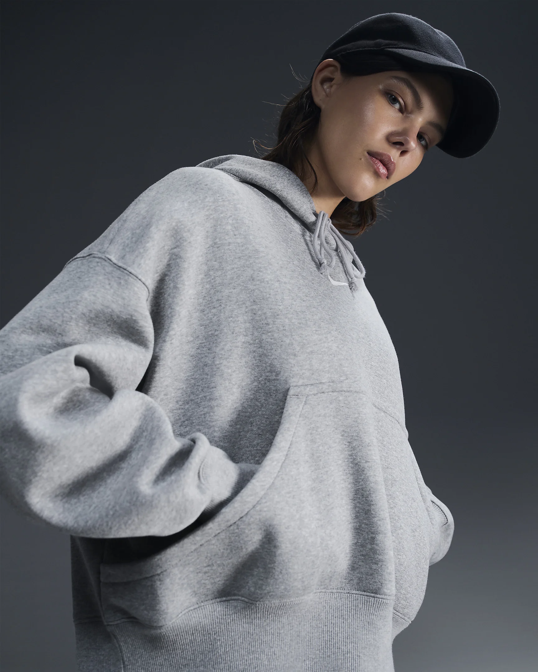 Grounded in style, comfort and versatility, meet our take on luxury loungewear. Our roomiest fit paired with exaggerated details (like the oversized pocket and taller ribbing) ensures this hoodie is anything but basic. All that's left to decide is whether to style it with the matching sweats or other pieces from your wardrobe. Benefits - Our midweight brushed fleece feels extra soft on the inside and smooth on the outside, helping you stay cozy while keeping its structured shape. - Dropped shoulder seams and roomy sleeves provide a relaxed, spacious feel. Product Details - Elongated ribbing - Drawcord hood - Front pocket - Body: 80% Cotton/20% Polyester. Hood lining: 100% Cotton. - Machine wash - Imported - Shown: Dark Grey Heather/Sail - Style: DQ5858-063 SIZE & FIT Model is wearing size S and is 5′10″178cm Oversized fit: exaggerated and spacious Fits large; we recommend ordering a size down