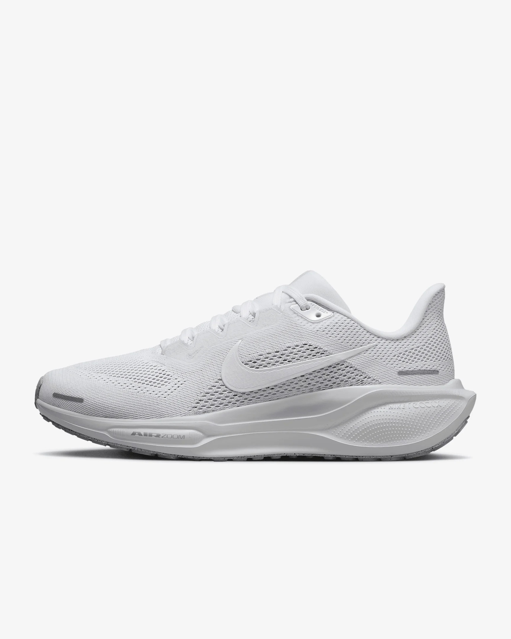 Responsive cushioning in the Pegasus provides an energized ride for everyday road running. Experience lighter-weight energy return with dual Air Zoom units and a ReactX foam midsole. Plus, improved engineered mesh on the upper decreases weight and increases breathability. Benefits - Upgraded breathable engineered mesh upper - ReactX foam midsole surrounds forefoot and heel Air Zoom units for an energized ride. - Signature waffle-inspired rubber outsole for traction and flexibility - Plush collar tongue and sockliner for a secure and comfortable fit - What's new? All-new ReactX foam midsole is 13% more responsive than previous React technology. - Crafted for performance and planet, ReactX foam is engineered to reduce its carbon footprint by at least 43% in a pair of midsoles due to reduced manufacturing process energy compared to prior React foam. The carbon footprint of ReactX is based on cradle-to-gate assessment reviewed by PRe Sustainability B.V and Intertek China. Other midsole components such as airbags, plates or other foam formulations were not considered. Product Details - Weight: Approx. 251 g/8.8 oz (Women's US 8) - Heel-to-toe drop: 10 mm - MR-10 Last - Our best, most consistent fit (same as Pegasus 40) - Not intended for use as Personal Protective Equipment (PPE) - Shown: White/Pure Platinum/Metallic Silver/White - Style: FD2723-102
