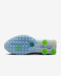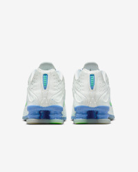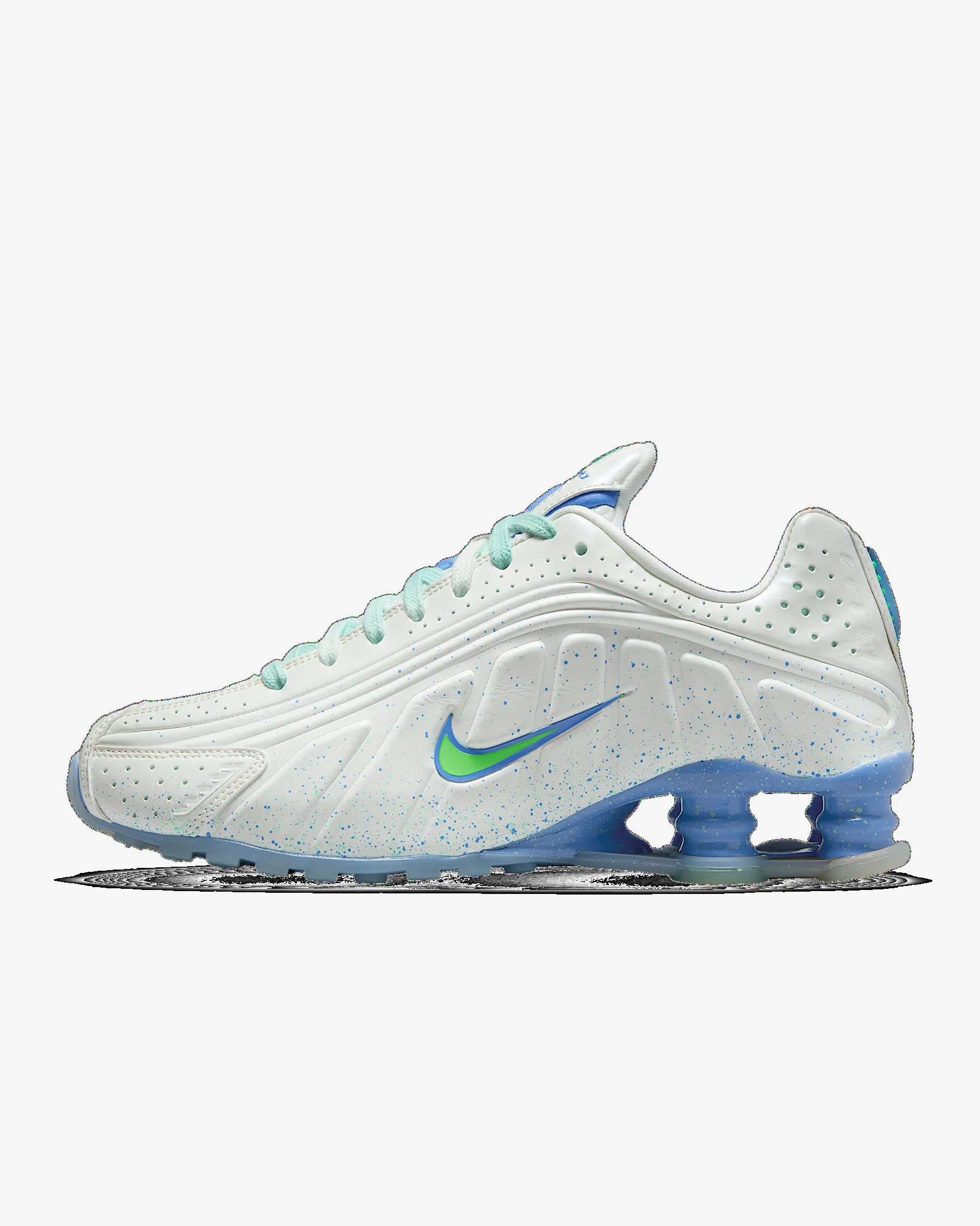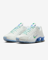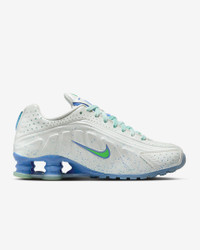 Inspired by the colors of Miami and the boundary-pushing artists that converge there yearly, this Shox R4 comes in hot with big colors fading into one another. Reflective details shimmer and pop with your every step. The Shox R4 has always been a distinct shoe with its standout heel, but combined with the bold and bright design, we dare you to find a stronger statement piece. Benefits - Originally designed to support the stride of runners, Nike Shox columns provide responsive cushioning. - Upper is a near-exact replica of the original 2001 Nike Shox. - Modified, circular Waffle outsole gives traction. - Laser perforations throughout provide ventilation. Product Details - Shown: Summit White/Royal Pulse/Mint Foam/Green Strike - Style: IH2343-100