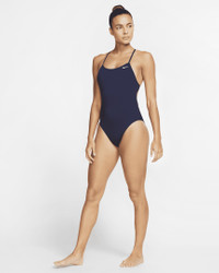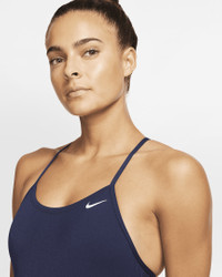The Nike Lace-Up Tie-Back Swimsuit matches a cheeky, flattering fit with a comfortable, distraction-free feel. Its medium-support straps and lace-back closure get your fit right without feeling too tight. Benefits - Nike HydraStrong fabric provides long-lasting durability, swim after swim. - Medium-support straps balance comfort and support. - Cheeky bottom coverage offers a flattering look and lets you move freely. - Flat seams help reduce chafing. Product Details - Heat-transferred Swoosh design - Body: 53% polyester/47% PBT. Lining: 100% polyester. - Hand wash - Imported - Shown: Midnight Navy - Style: NESSA000-440 SIZE & FIT Standard fit: easy and traditional