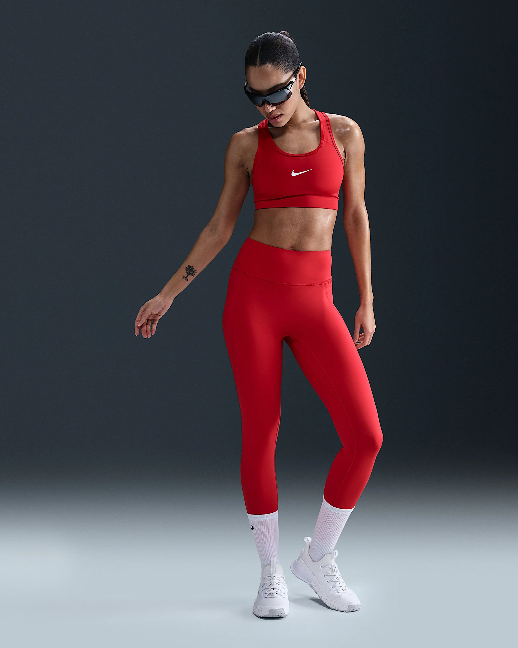Don't let 'em see you sweat. We elevated the design of our Universa leggings to look smooth and help conceal sweat, thanks to a no-seam front and moisture-concealing technology. Their midweight, ultrasmooth fabric offers squat-proof stretch that helps lift and shape. Plus, an updated waistband resists rolling, so you can go all out with confidence. Product Details - 77% polyester/23% spandex - Laser-cut hem - Silicone Swoosh logo on left calf - Machine wash - Imported - Not intended for use as Personal Protective Equipment (PPE) - Shown: University Red/University Red/Varsity Red - Style: HQ6813-657 SIZE & FIT Model is wearing size S and is 5′9″175cm Tight fit: snug and form-fitting Medium support: feels ke a snug hold to keep everything in place 78 length: hits at ankle High-Waisted: sits at or above your natural waist for more coverage