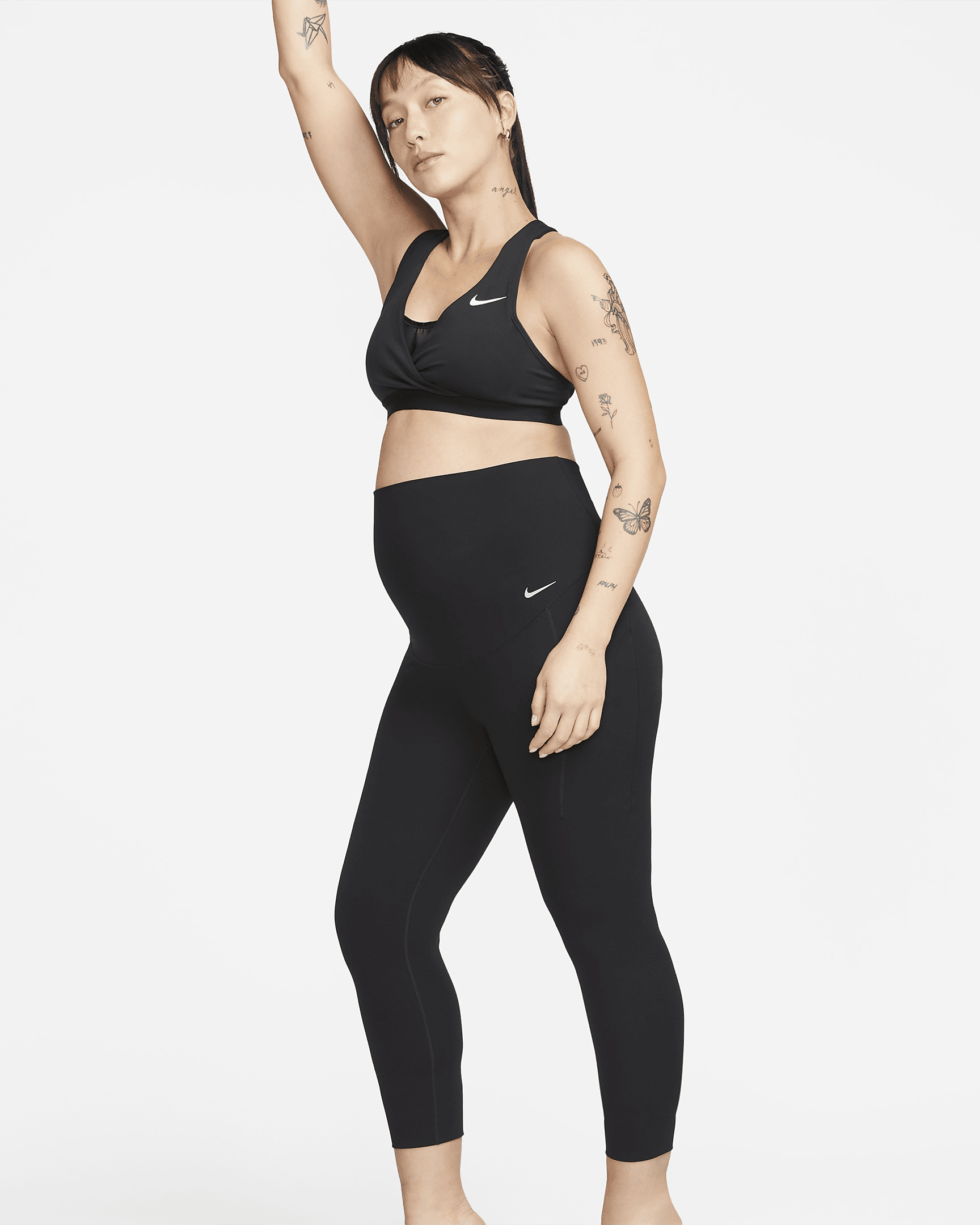 Whether it's yoga or a bike ride or a walk, you can move freely in our unbelievably soft Nike Zenvy leggings. Their InfinaSoft fabric is lightweight—but still squat-proof!—with softness that you can feel with every bend, stretch and shift. As your body changes, the maternity design gives you extra space where you need it so it adapts through your pregnancy. Plus, they're durable enough for you to move, wash and wear again and again. Benefits - Designed to help reduce rolling, pinching and sliding, extra-wide waistband helps cover your bump and folds down when you're ready to relax. - Nike Dri-FIT technology moves sweat away from your skin for quicker evaporation, helping you stay dry and comfortable. - Drop-in thigh pockets are large enough to hold most phones. Product Details - Body: 63% nylon/37% spandex. Gusset lining: 84% nylon/16% spandex. - Machine wash - Imported - Shown: Black - Style: DV9432-010 SIZE & FIT Tight fit: snug and form-fitting Gentle support: feels ke a soft hug with plenty of freedom 78 length: hits at ankle Maternity Waistband: foldable waistband is designed to grow with you—before, during and after pregnancy