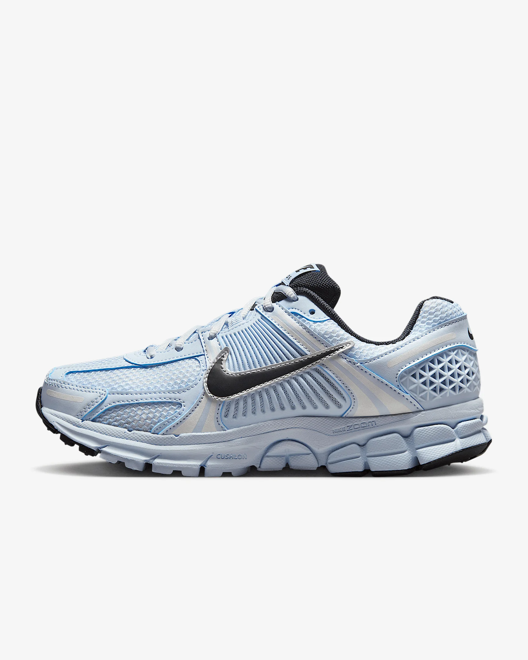 Carve a new lane for yourself in the Zoom Vomero 5—your go-to for complexity, depth and easy styling. The richly layered design includes textiles, synthetic leather and plastic accents that come together to make one of the coolest sneakers of the season. Benefits - Snappy and responsive, Zoom Air cushioning helps provide a quick-off-the-ground sensation. - Plastic caging on the side adds a supportive feel. - Rubber outsole gives you durable traction. Product Details - Reflective details - Not intended for use as Personal Protective Equipment (PPE) - Shown: Blue Tint/Platinum Tint/Metallic Platinum/Black - Style: FJ2028-401