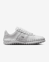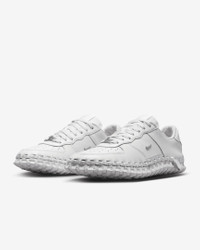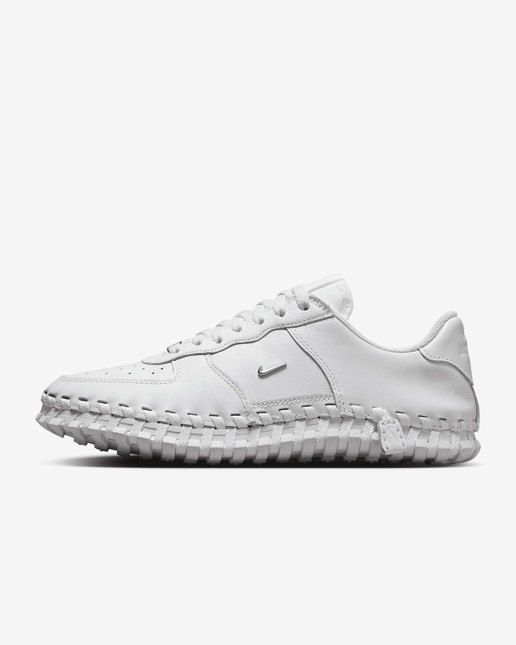 Inspired by traditional crafting and a desire to reintroduce the human element into shoe construction, Nike and Jacquemus created the J Force 1. Notes were taken from Nike Considered, the early-2000s project known for using minimal glue as a means to lessen the environmental impact of footwear production. All of this hypothetical influence resulted in a shoe that looks equally at home in an art museum as it does in the outside world. Benefits - Modified Air Force 1 upper is handwoven to the sole, reducing the use of glue. - Inverted logos on the outsole imprint correctly when you lift your foot. - Textured webbing system is structurally sound and visually striking. Product Details - Foam midsole - Rubber outsole - Shown: White/White/Phantom/Metallic Silver - Style: DR0424-100