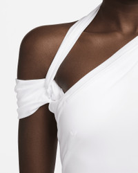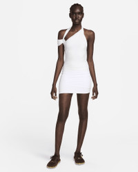 French fashion designer Simon Porte Jacquemus reunites with Nike to create a one-of-a-kind collection. Soft, smooth and stretchy—this statement dress has everything you need for form-fitting style. The length hits at mid-to-upper thigh, while the strappy design creates an asymmetrical look. Co-branded brushed metal hardware, including a metal Swoosh closure, adds a polished finish. Benefits - Brushed silver details round out your elevated look. - Lightweight fabric moves sweat away from your skin for quick evaporation, helping you stay dry and comfortable. Product Details - Body: 84% Polyester/16% Spandex. Middle Panel: 71% Nylon/29% Spandex. Lower Panel/Lining: 70% Nylon/30% Spandex. - Machine wash - Imported - Shown: White - Style: FJ3140-100 SIZE & FIT Model is wearing size XS and is 5′10″178cm Standard fit: easy and traditional