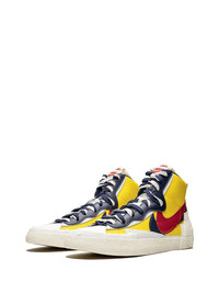 x sacai Blazer Mid "Varsity Maize" sneakers The Sacai x Nike Blazer Mid “Varsity Maize” is a unique edition of the classic model by the renowned fashion house. Similar to the hit LDV Waffle by Sacai that released earlier in 2019, this Sacai Blazer receives an avant-garde layered redesign. The premium leather construction features double Swooshes and double tongues, and layered eyestay panels. The midsole also has multiple layers of foxing that extend up the ankle area. This colorway features a Varsity Maize base with navy and red accents. Two sets of shoelaces are included to amplify the doubled-up effect. The limited edition Sacai x Nike Blazer Mid “Varsity Maize” released in spring 2019. Made in United States Composition Calf Leather 100%