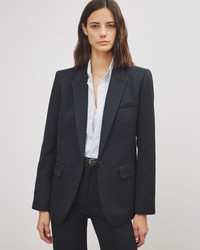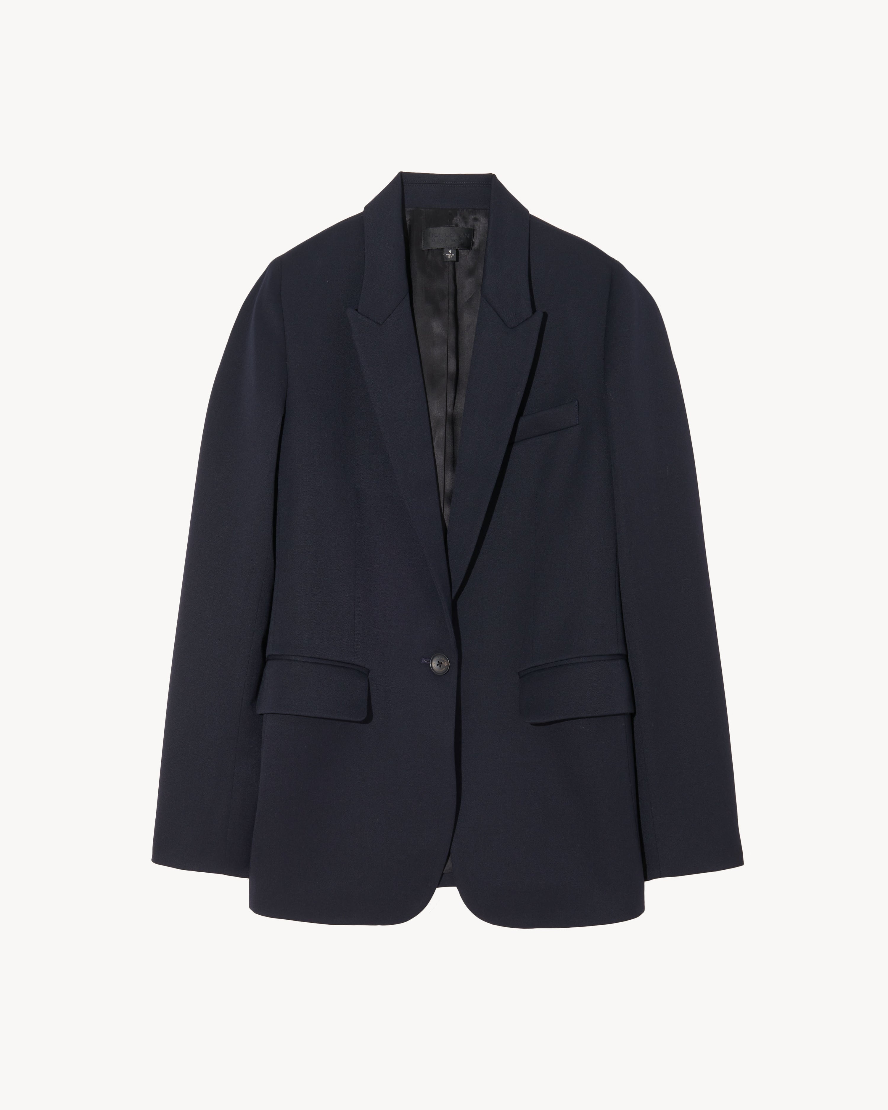 Modern oversized jacket, slimmed down and trimmed up. Italian wool gabardine selected for its excellent drape. Single breasted. Fully constructed. Peak lapels. Single button closure. Chest welt and flap pockets. Center back vent. Fully lined . Made in USA COMPOSITION & CARE 100% VIRGIN WOOL, MADE IN USA OF IMPORTED FABRIC DRY CLEAN ONLY