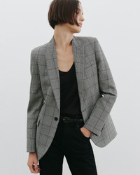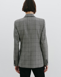 Slim body jacket blazer. Fitted at the hip. Canvas piece interior construction with shoulder pads and structured sleeve head. Keyhole detail at lapel. Exterior chest pocket and functional front pockets with flaps. Horn button at front and buttons at cuff. Interior chest pocket. Seams for shape. Back vent. Fully lined. - 100% Virgin Wool - Dry clean only - Do not bleach - Low iron