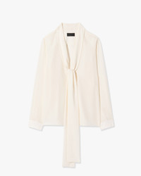 Relaxed deep v neck-tie blouse. Exposed centerfront buttons. Made in USA SIZE & FIT Model is 5'11 with 32.5" bust, 25.5" waist, and 35" low hip. Model wears size S. Size S measures approximately 25 1/2” front body length, 16 1/2" across shoulders, 40" chest circumference, 41" hem circumference, 31 3/4” sleeve length from center back neck. COMPOSITION & CARE 100% SILK, MADE IN USA DRY CLEAN ONLY LOW IRON