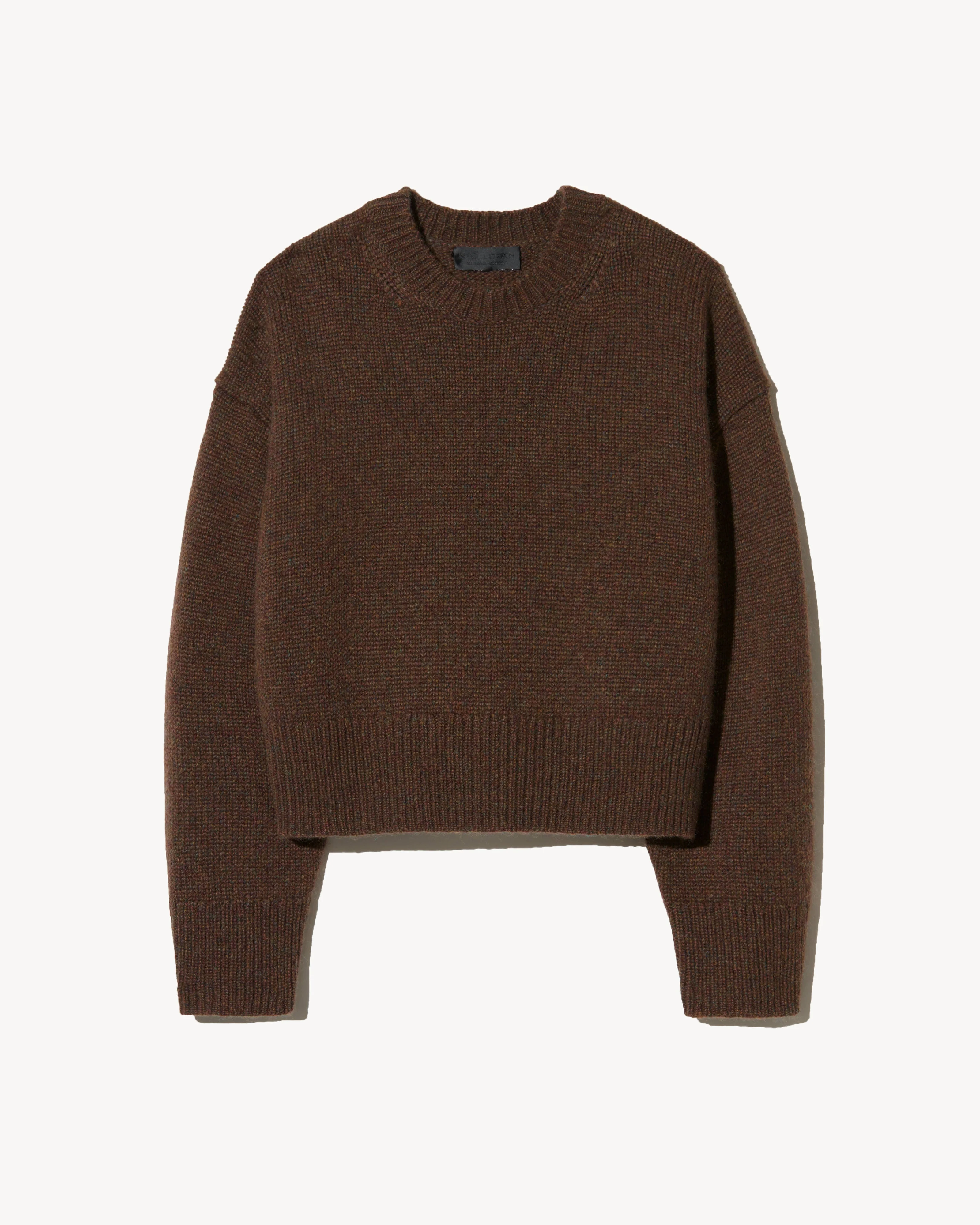 Chunky weight, oversized boxy sweater. Regular body and sleeve length. Dropped shoulder. Rib start at hem and sleeve. Single layer rib at neck. Fashioning along arm hole. Signature center back cable knit detail. - 100% Cashmere - Dry clean recommended