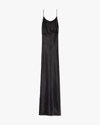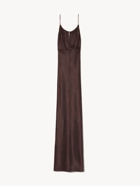 Column-style fit floor-length gown in charmeuse silk. Keyhole openings at front and back with adjustable ties. Adjustable front panel for customizable coverage. Low armholes. Empire waist seam. Invisible zipper at back. Unlined. Not bra-friendly. - Made in USA - 100% Silk - Dry clean only - Low iron