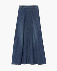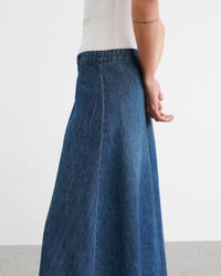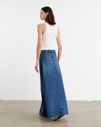 Floor length mid- to low-rise denim skirt. Clean waistband. No belt loops. Front center seam. Classic denim hem finishing. Full through skirt. Back zip. Shank closure. Made in USA COMPOSITION & CARE 60% COTTON, 40% LINEN MACHINE WASH COLD DO NOT DRY CLEAN TUMBLE DRY LOW MEDIUM IRON DO NOT BLEACH