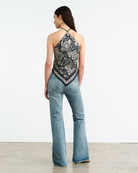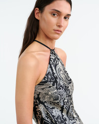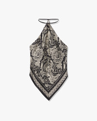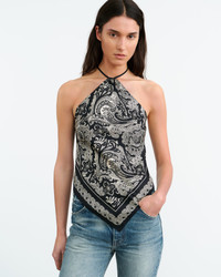 Slim halter top in custom paisley printed Italian silk twill. Angled scarf hemline shows skin at waist. Unlined. Made in USA COMPOSITION & CARE 100% Silk Dry clean only Low iron