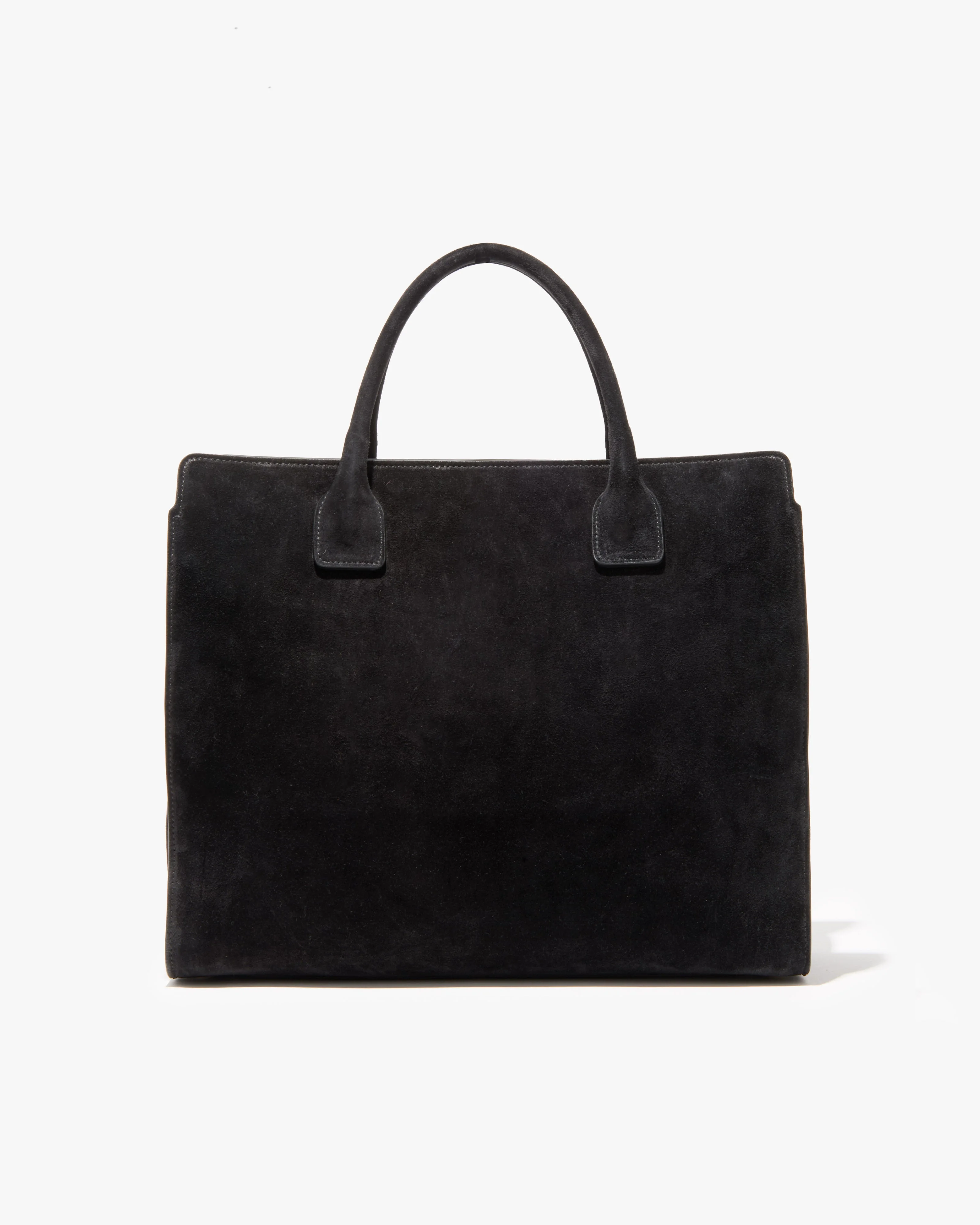 Top-handle bag in in Italian suede. Soft, semi-structured hand feel. Signature gold hardware. Italian suede interior lining. Interior zipper pocket. Dimensions (Inches) : 12” Height , 14” Length , 5.5” Depth , 5” Handle Drop , 15.5” Shoulder Drop - 100% Calfskin - Professional leather care only
