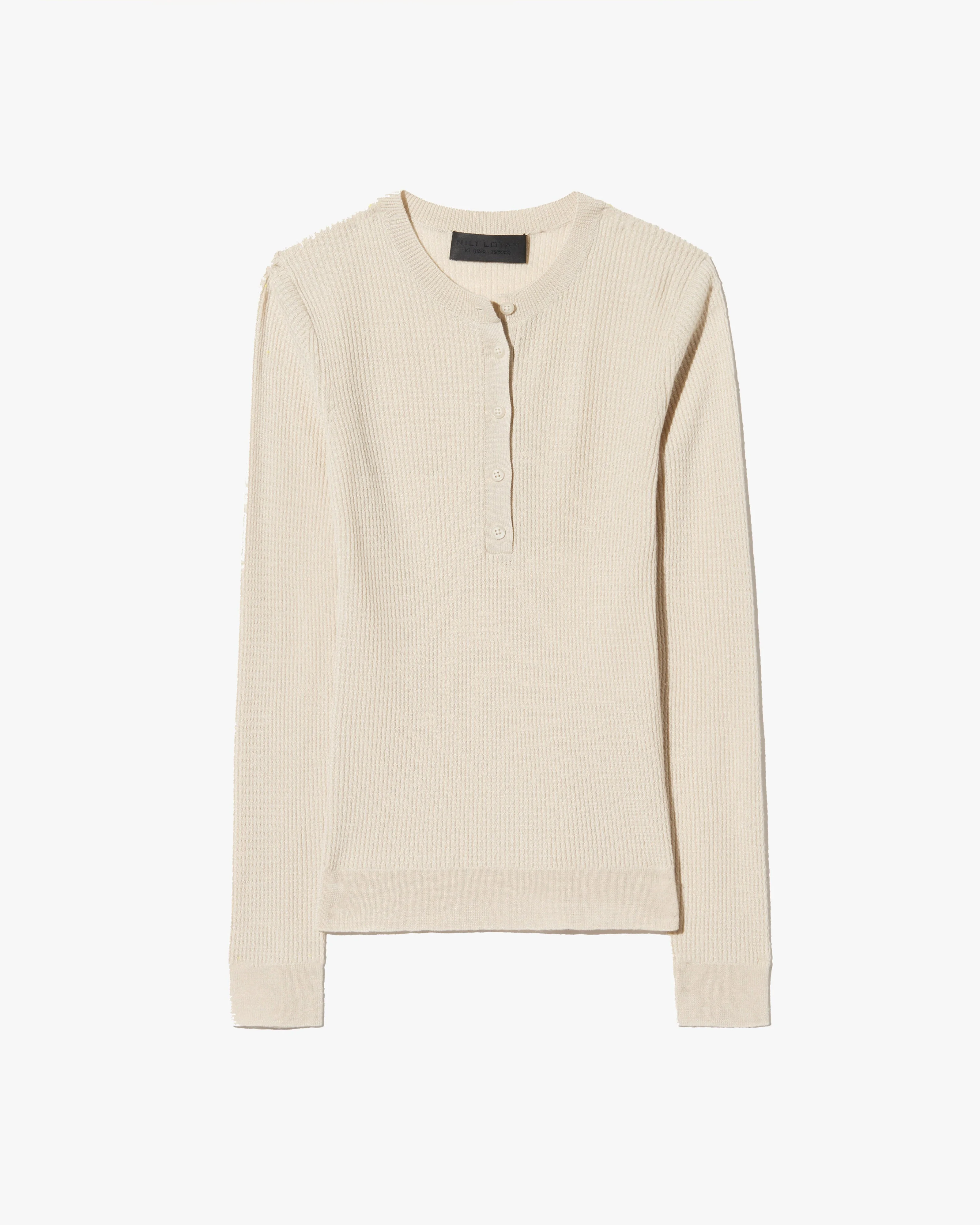 Long sleeve henley sweater. Fine gauge micro cable stitch. Slim fit. Regular body length. Wrist length sleeve. 1x1 rib at hem and sleeve. Single layer neck rib. Fashioning details at armhole and back shoulder. Rib placket with button closure. - 70% Merino Wool 30% Silk - Dry clean recommended
