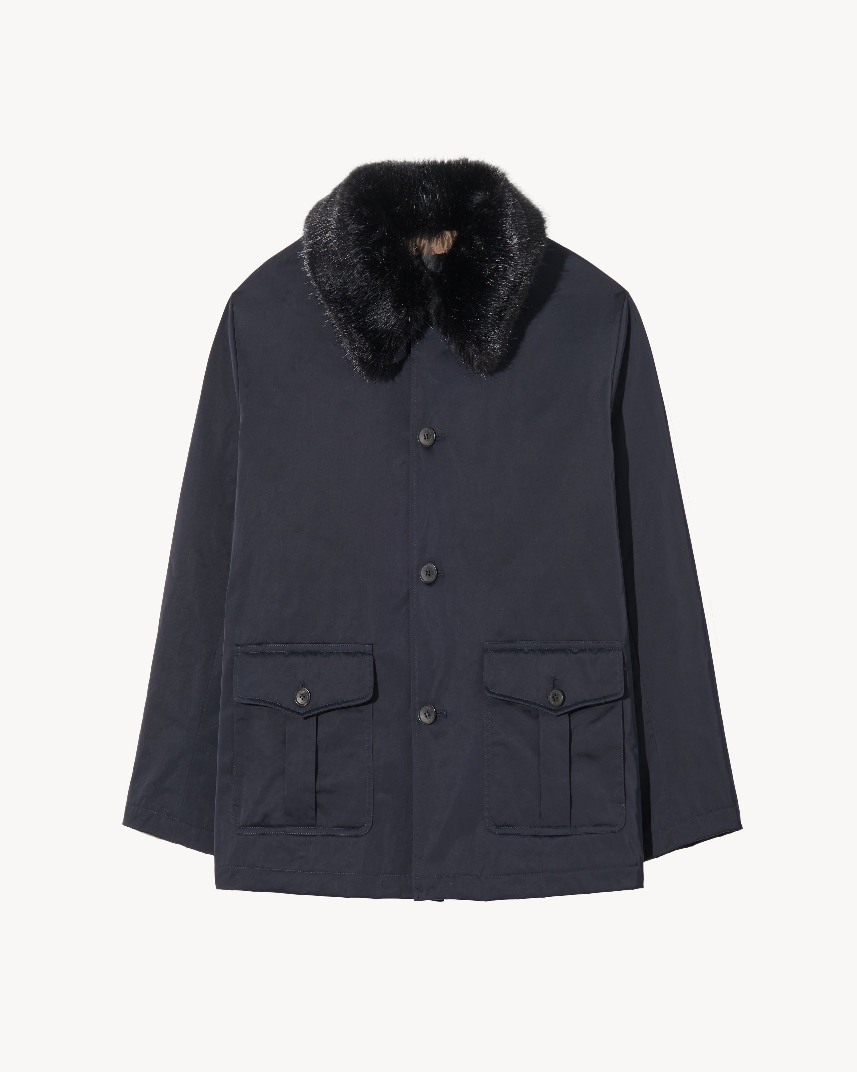 Relaxed nylon parka. Removable faux fur collar. Slight drop shoulder. Military pocket detail. Quilted lining. Water resistant. Made in USA SIZE & FIT Model is 5'11 with 32.5" bust, 25.5" waist, and 35" low hip. Model wears size 4. Size 4 measures approximately 29” front body length, 21 3/4” across shoulders, 51 1/4” chest circumference, 52” hem circumference, 33 3/4” sleeve length from center back neck. COMPOSITION & CARE 52%POLYESTER 48%NYLON, MADE IN USA DRY CLEAN ONLY