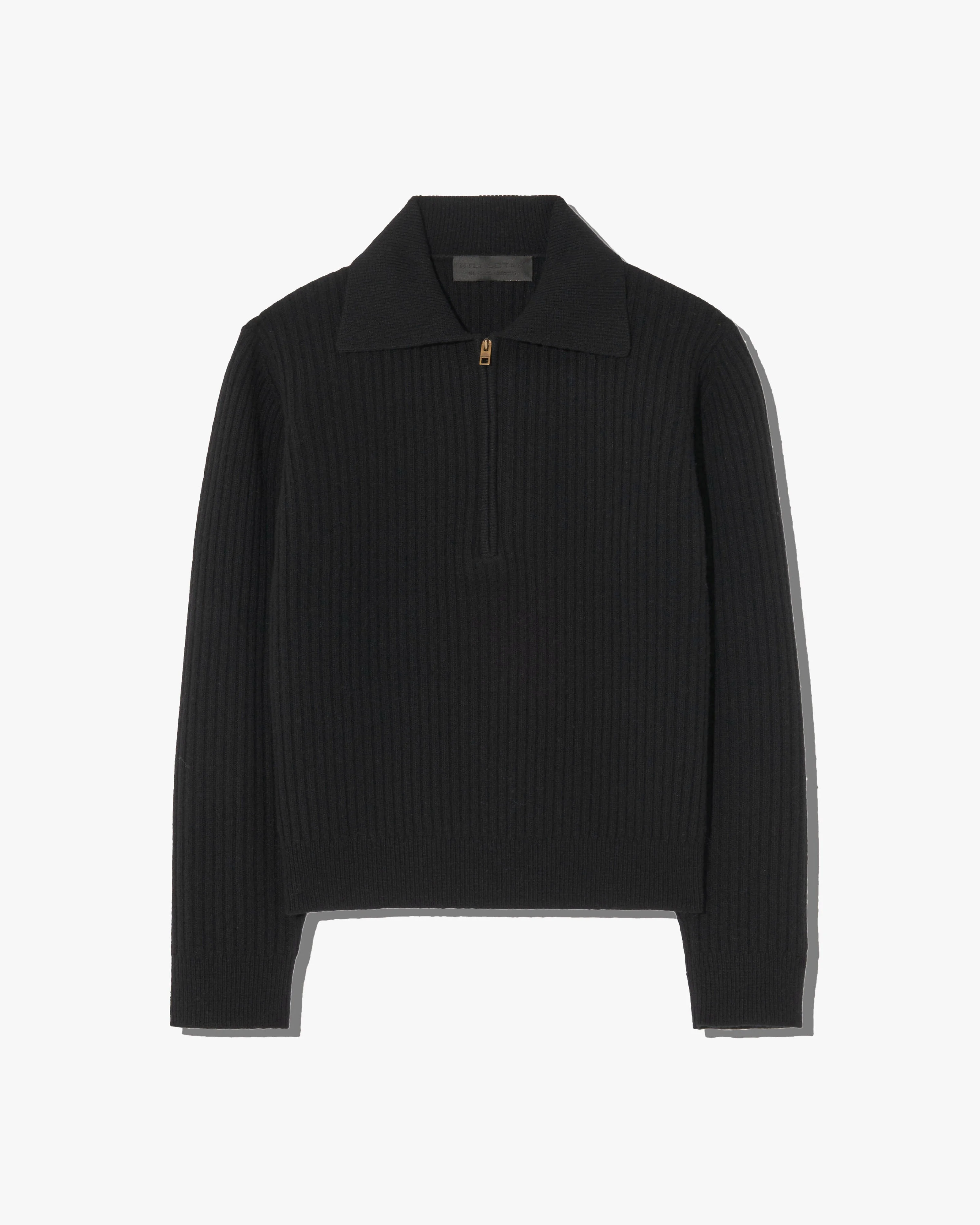 Medium weight ribbed polo sweater in Italian wool. Logo zipper in antique brass. Rib start at hem and sleeve. Fashioning along arm hole. - 100% Lambswool - Dry clean recommended