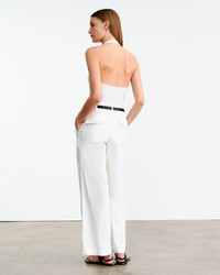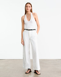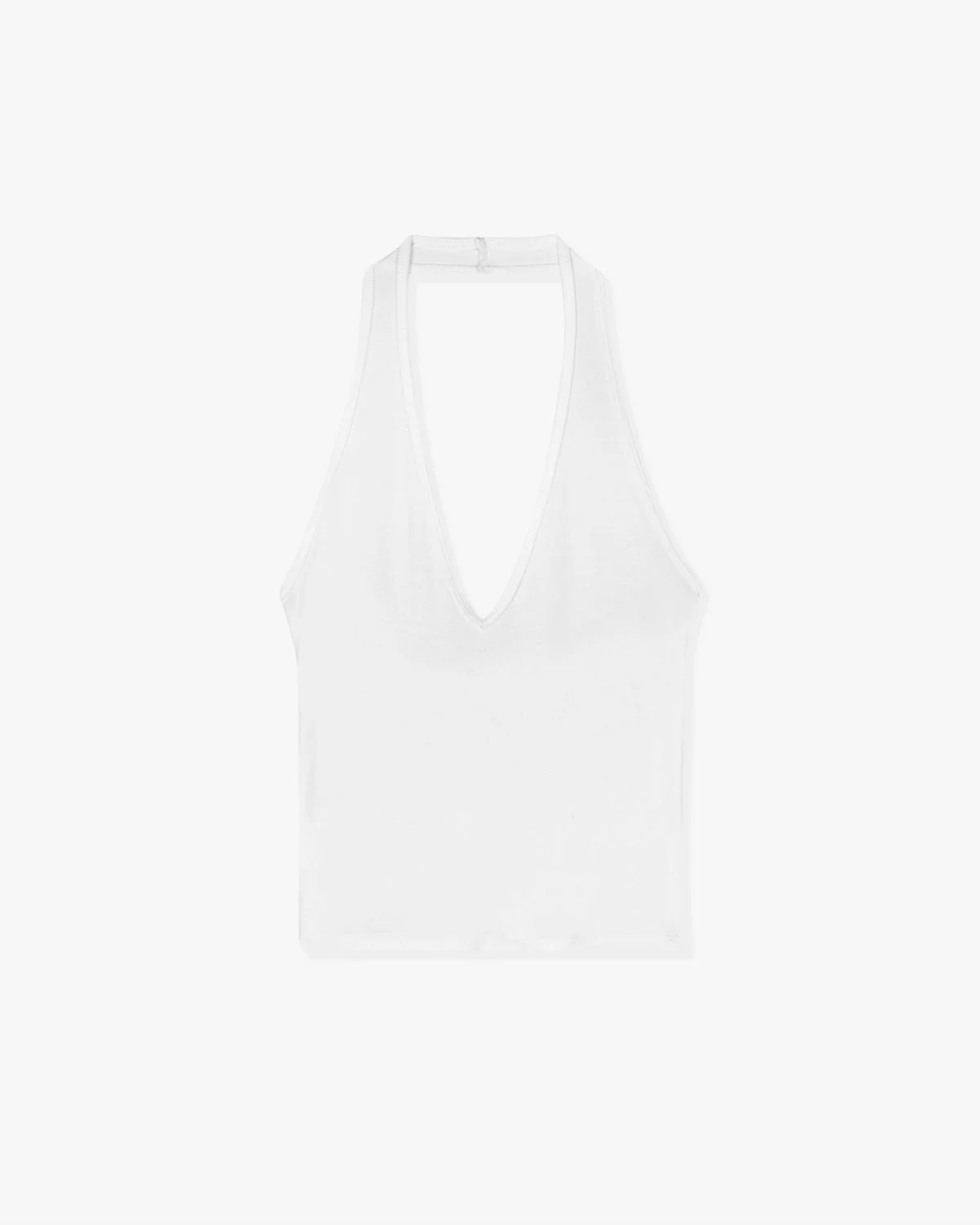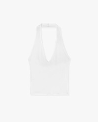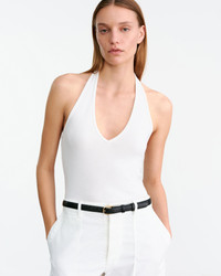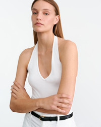 Slim ribbed halter top in American cotton. V neck. Binding at neck and arm hole. Short body. - Made in USA - 100% Cotton - Machine wash cold - Do not bleach - Tumble dry low - Low iron - Dry clean recommended