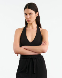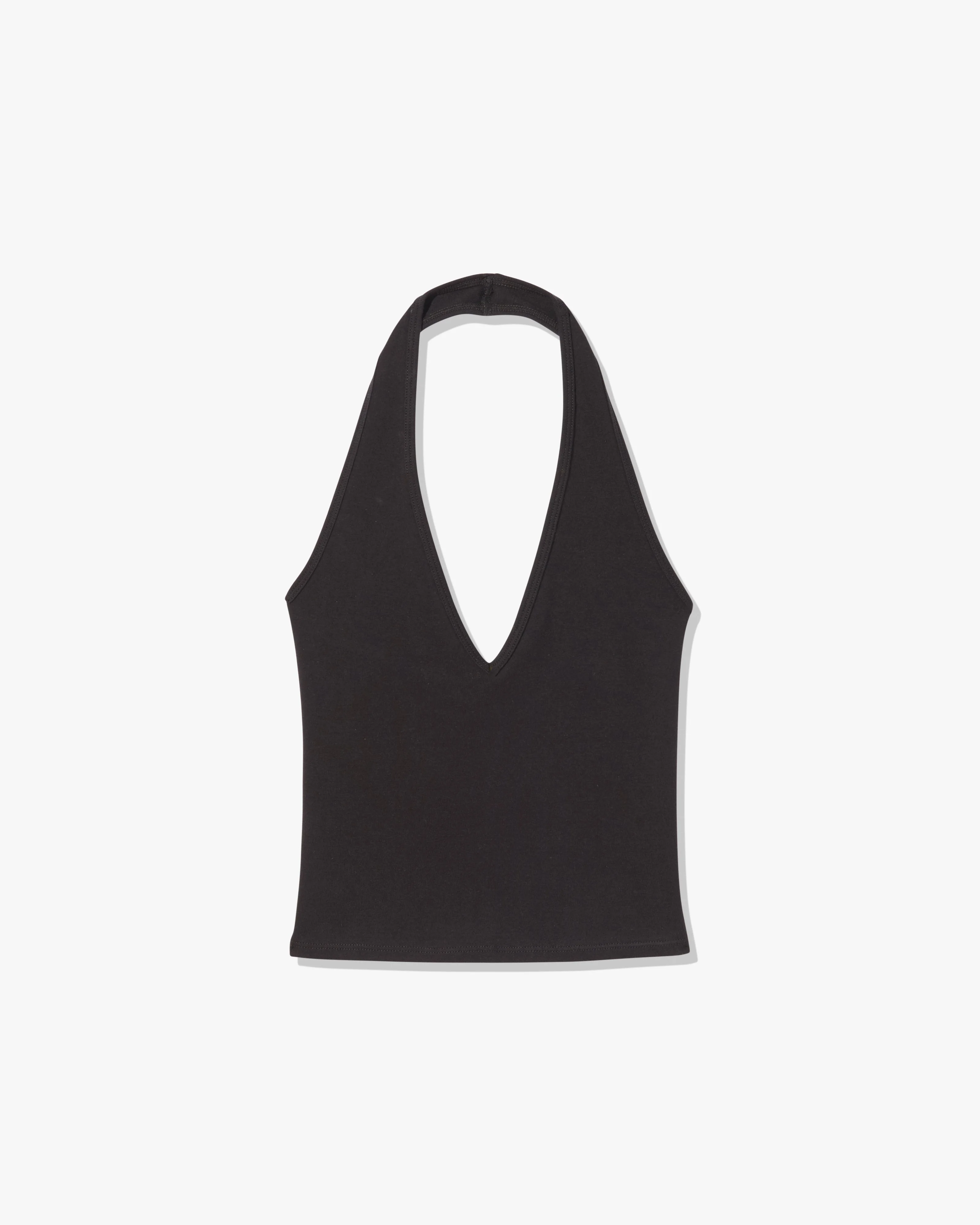 Slim ribbed halter top in American cotton. V neck. Binding at neck and arm hole. Short body. Made in USA COMPOSITION & CARE 100% Cotton Machine wash cold Do not bleach Tumble dry low Low iron Dry clean recommended