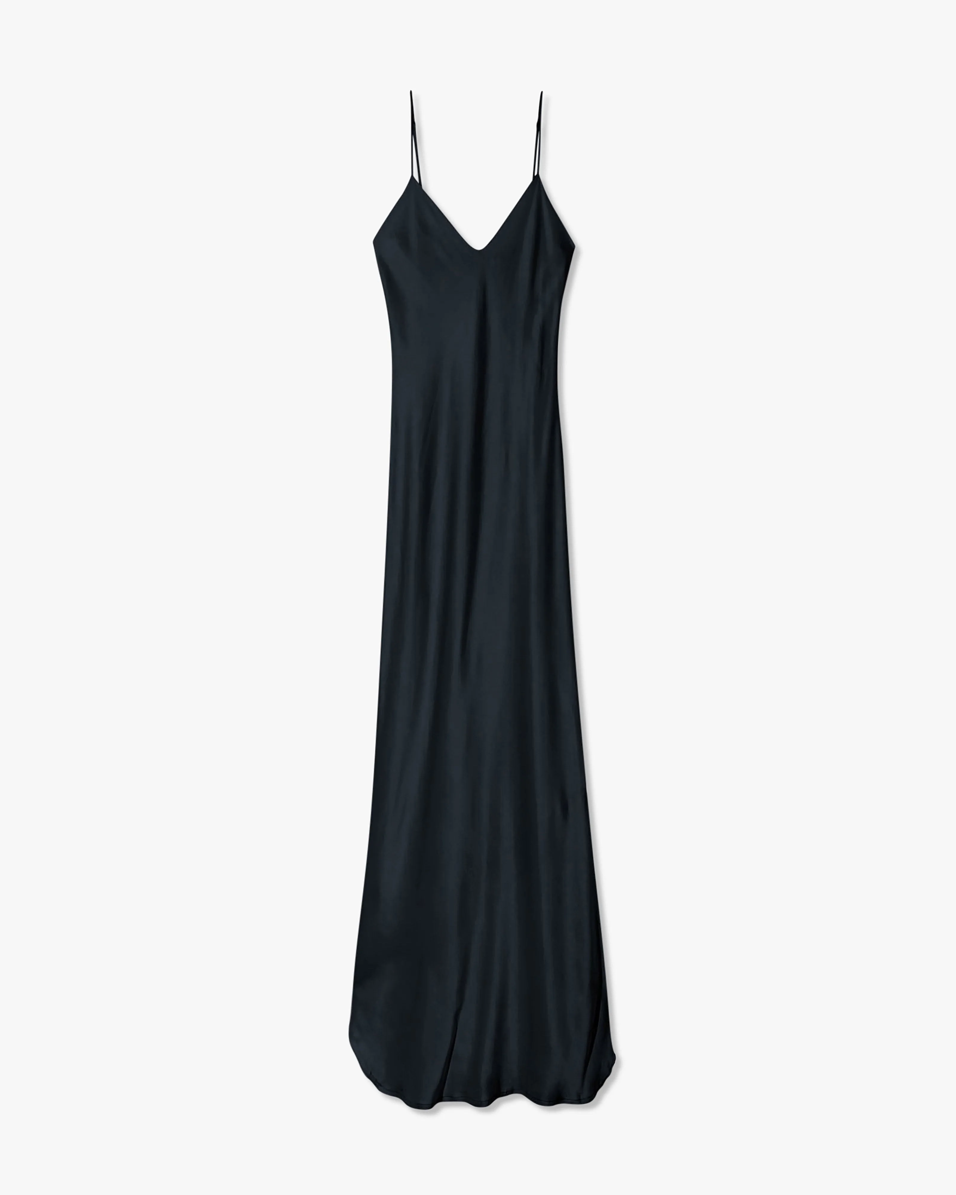 Lightweight silk charmeuse bias cut floor length gown. Adjustable skinny straps. Shirt tale detail at hem. Made in USA SIZE & FIT Model is 5'11 and wears a size S. For exact measurements by size, view our size guide. COMPOSITION & CARE 100% SILK, MADE IN USA DRY CLEAN ONLY LOW IRON