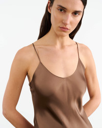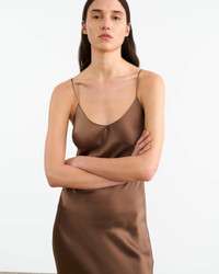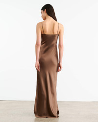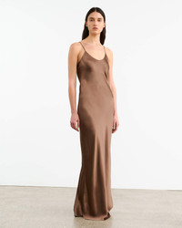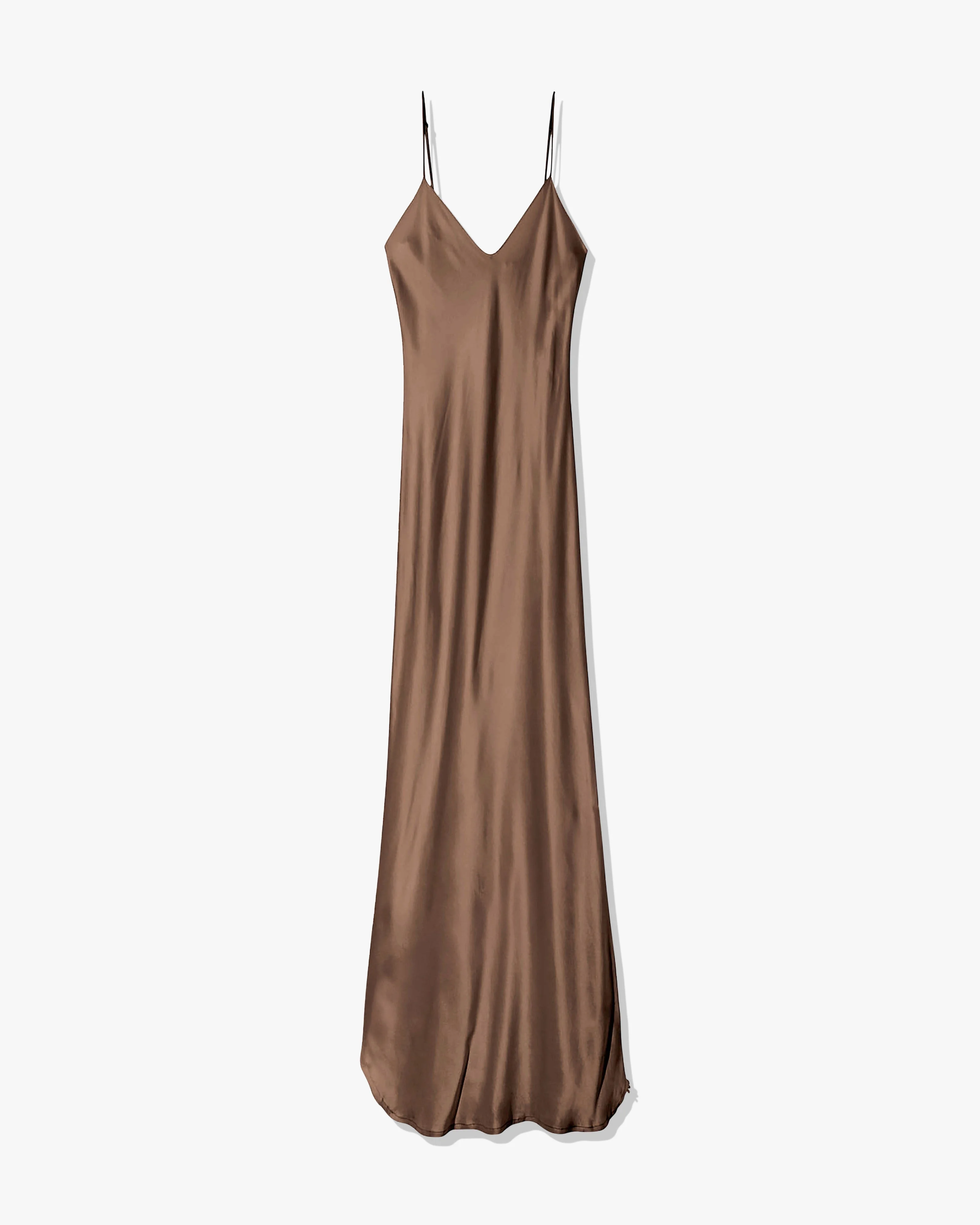 Bias cut floor length gown in silk charmeuse. Adjustable skinny straps. Shirt tale detail at hem. Made in USA COMPOSITION & CARE 100% SILK, MADE IN USA Dry clean only Low iron