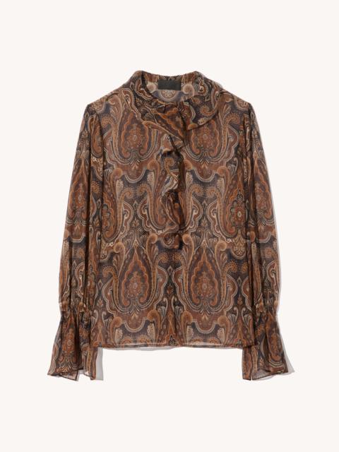 Relaxed button up top in Italian silk chiffon. Ruffle detail at collar and center front. Shirring details at back yoke. Straight hem. Ties at cuff. Made in USA COMPOSITION & CARE 100% SILK Dry clean only Low iron