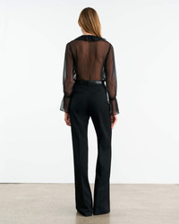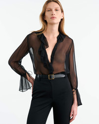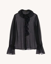 Relaxed button up top in Italian silk chiffon. Ruffle detail at collar and center front. Shirring details at back yoke. Straight hem. Ties at cuff. Made in USA COMPOSITION & CARE 100% SILK Dry clean only Low iron