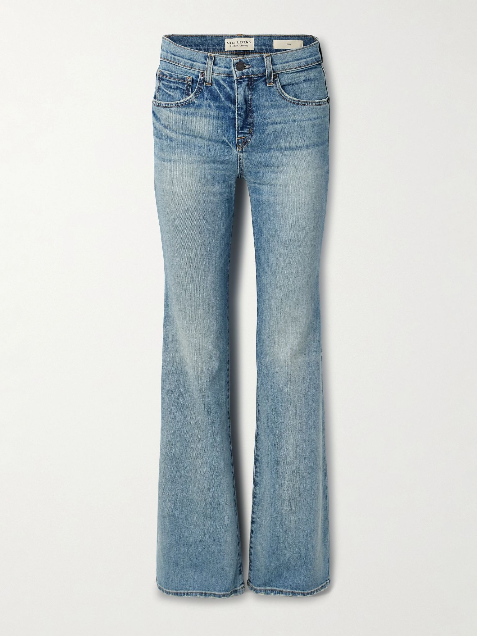 EXCLUSIVE AT NET-A-PORTER. Nili Lotan's 'Celia' jeans have subtly flared straight legs that are perfectly aligned with the collection's '70s aesthetic. In a faded 'Summer' wash, they're made from structured denim and have a flattering high-rise waist. Wear yours with a tucked-in tee. Size & Fit - Fits true to size, take your normal size - High-rise, cut for a straight-leg fit - Mid-weight, slightly stretchy fabric - Size 26 jeans have an inside leg of 33.8”/ 86cm - Model is 175cm/ 5'9" and is wearing a size 26 Details & Care - Blue denim - Button and concealed zip fastening at front - 98% cotton, 2% polyurethane - Machine wash - Designer wash: Summer