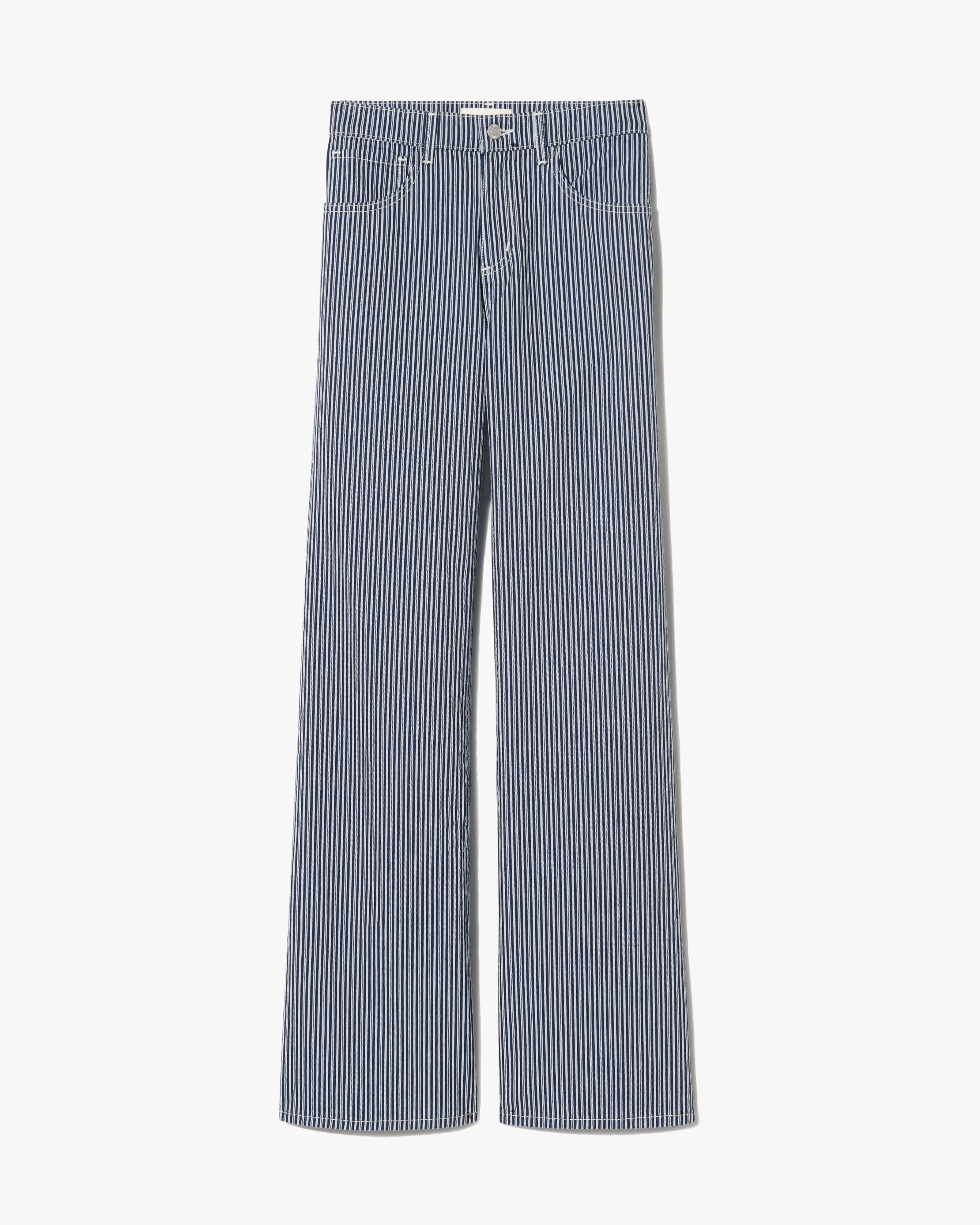 Mid-rise flare leg jean in non-stretch Japanese indigo-striped denim. Fitted from waist through hip. Classic five pocket details. Zip fly. Branded shank closure. Rivets at front pockets. Belt loops at front and back. Expertly crafted in the USA from premium Japanese non-stretch indigo-striped denim. Naturally softens with wear, and may feature subtle variations in wash and texture from artisanal hand-washing techniques.