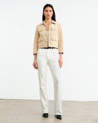 Shrunken fit jacket. Rounded collar. Soft shoulder pads with structured sleeve heads. Chest flap pockets and front patch pockets with flaps. Button closures at center front, pockets, and sleeves. Crest buttons in antique gold. Center back seam. Fully lined. COMPOSITION & CARE 95% Cotton, 5% Polyurethane Dry clean only Low iron Do not bleach