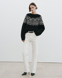 Crew neck, long sleeve, pullover sweater. Chunky jersey stitch with fairisle pattern across the chest. Relaxed boxy body, regular sleeve length, medium body length. 1x1 rib at hem, sleeve, and neckline. - 90% Cashmere, 10% Silk - Dry clean only