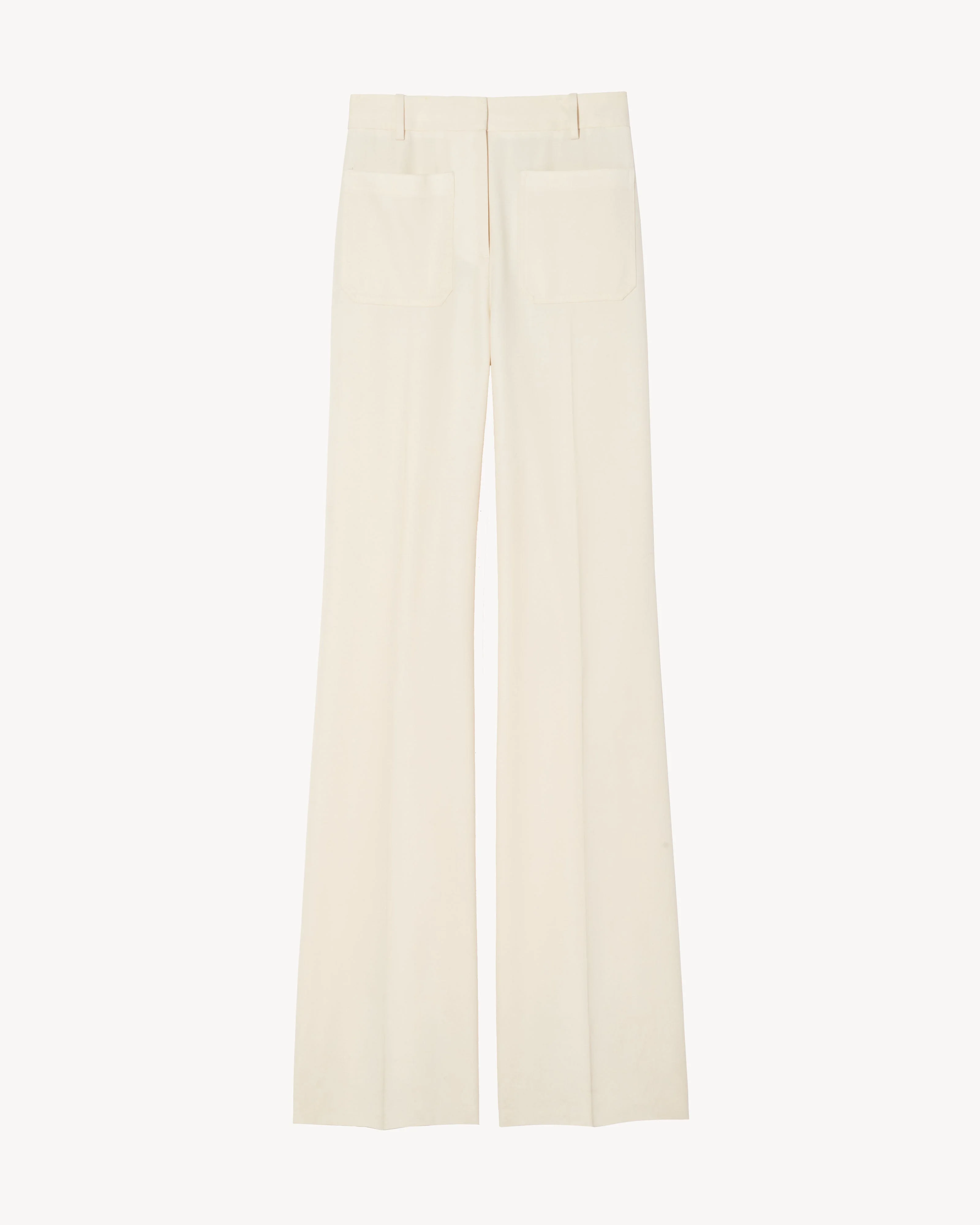 Flat front super high waist straight leg pant. Slight flare at hem. Front and back patch pockets. Zip fly and hook-and-bar front closure. Made in USA SIZE & FIT Size 4 measures approximately 29" waist circumference, 36" low hip circumference, 35" inseam, 24" leg opening, 12" front rise. COMPOSITION & CARE 100% VIRGIN WOOL, MADE IN USA OF IMPORTED FABRIC DRY CLEAN ONLY