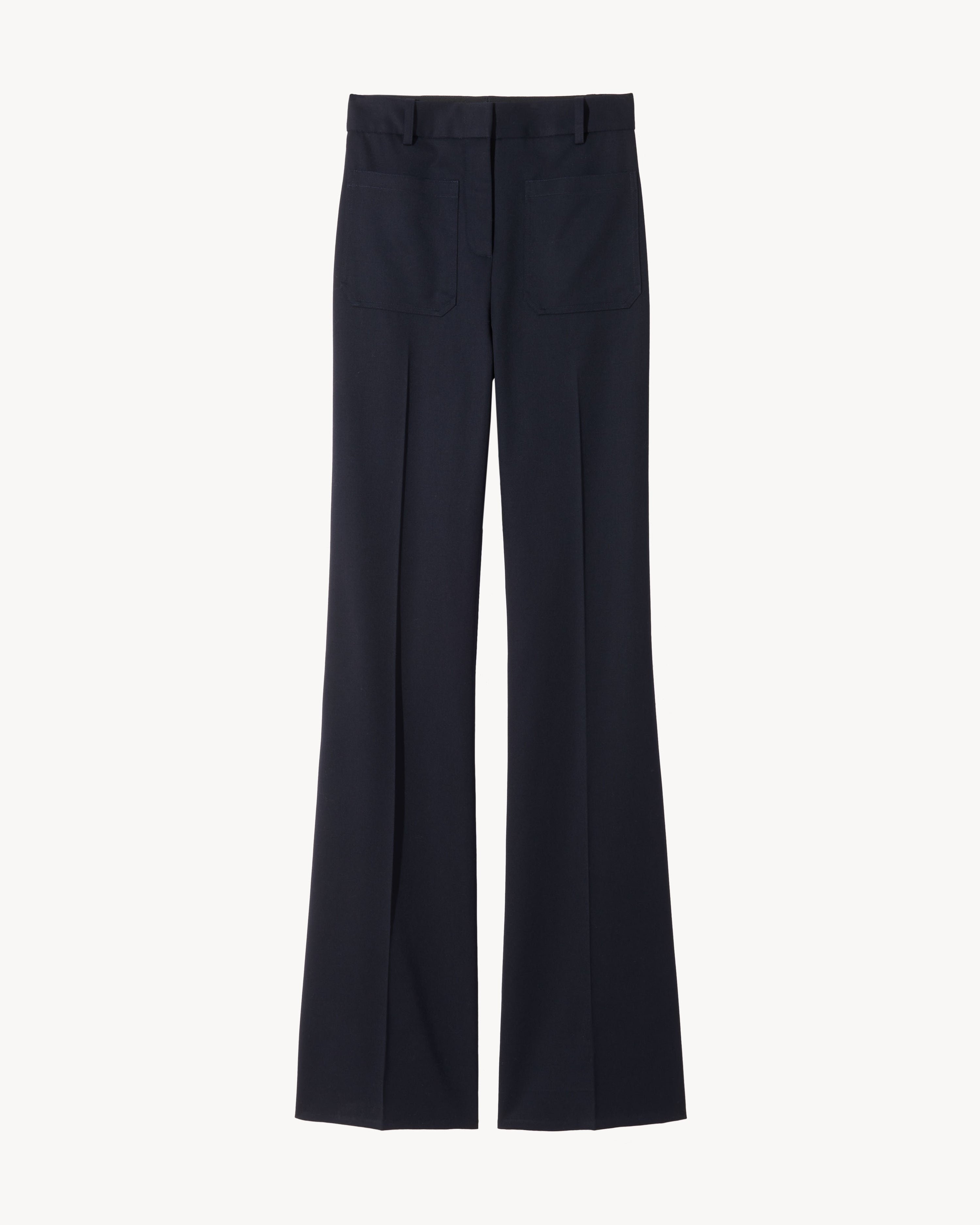 Flat front super high waist straight leg pant. Slight flare at hem. Front and back patch pockets. Zip fly and hook-and-bar front closure. Made in USA SIZE & FIT Size 4 measures approximately 29" waist circumference, 36" low hip circumference, 35" inseam, 24" leg opening, 12" front rise. COMPOSITION & CARE 100% VIRGIN WOOL, MADE IN USA OF IMPORTED FABRIC DRY CLEAN ONLY