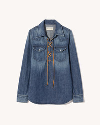 Classic, straight fit collared jean shirt in Japanese stretch denim. Western details. Lace up detail in suede. Chest flap pockets. Pearl snap buttons at front and cuff. Standard placket. Western yoke detail. Remove suede cording before cleaning. Made in USA COMPOSITION & CARE 100% COTTON Machine wash cold Tumble dry low Medium iron Do not bleach Do not dry clean