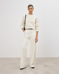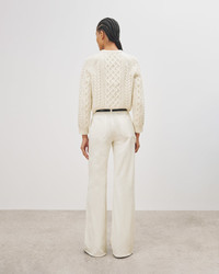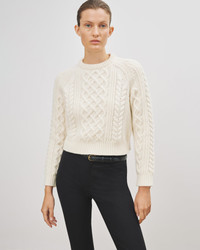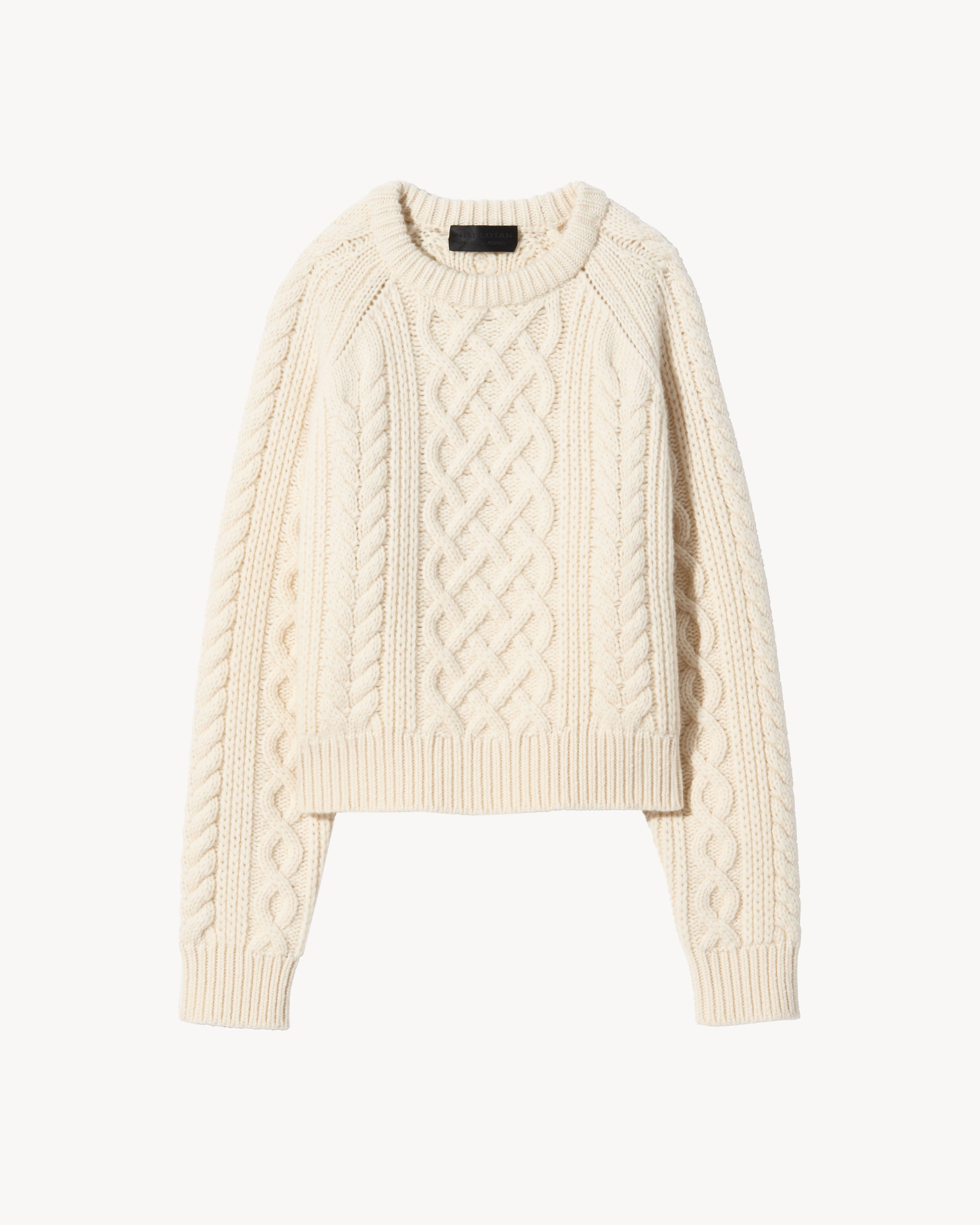 Chunky weight slim cableknit sweater. Fully fashioned along shoulder and arm hole. Rib at hem. Raglan arm hole. SIZE & FIT Model is 5'11 with 32.5" bust, 25.5" waist, and 35" low hip. Model wears size S. Size S measures approximately 19" front body length, 18 3/4" chest width, 16 3/4" hem width. COMPOSITION & CARE 100% LAMBSWOOL DRY CLEAN RECOMMENDED