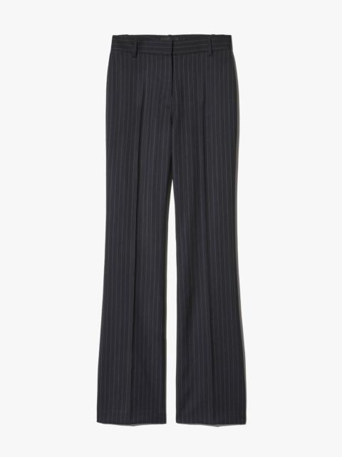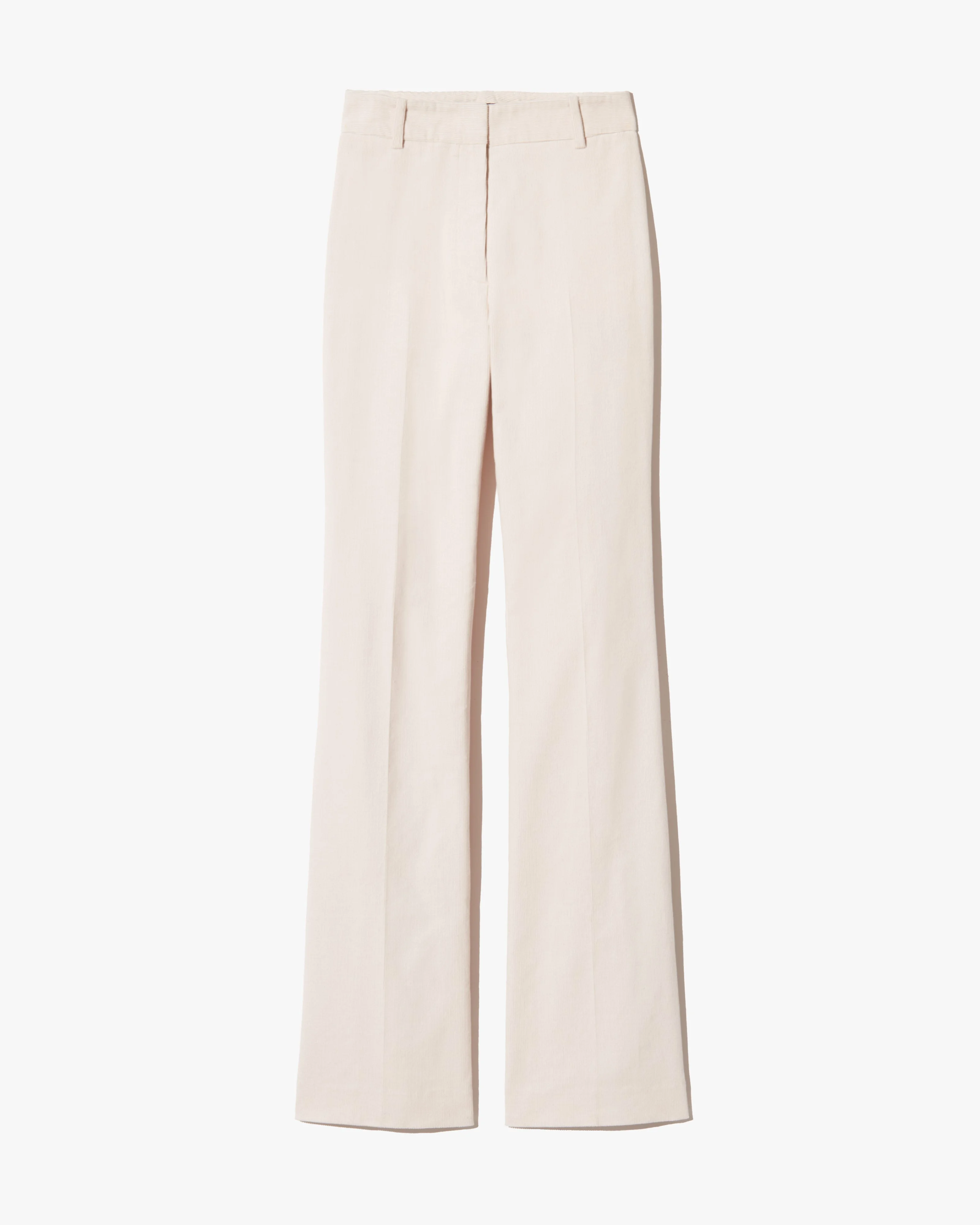 Flat front, high-rise straight leg trouser. Fitted through hips. Zip fly. Hidden hook-and-bar closure. Hidden stay button closure. Belt loops. Back welt pockets. Designed for a 35" inseam. - Made in USA - 100% Cotton - Machine wash cold - Do not bleach - Do not tumble dry - Lay flat to dry - Do not dry clean