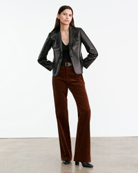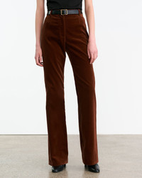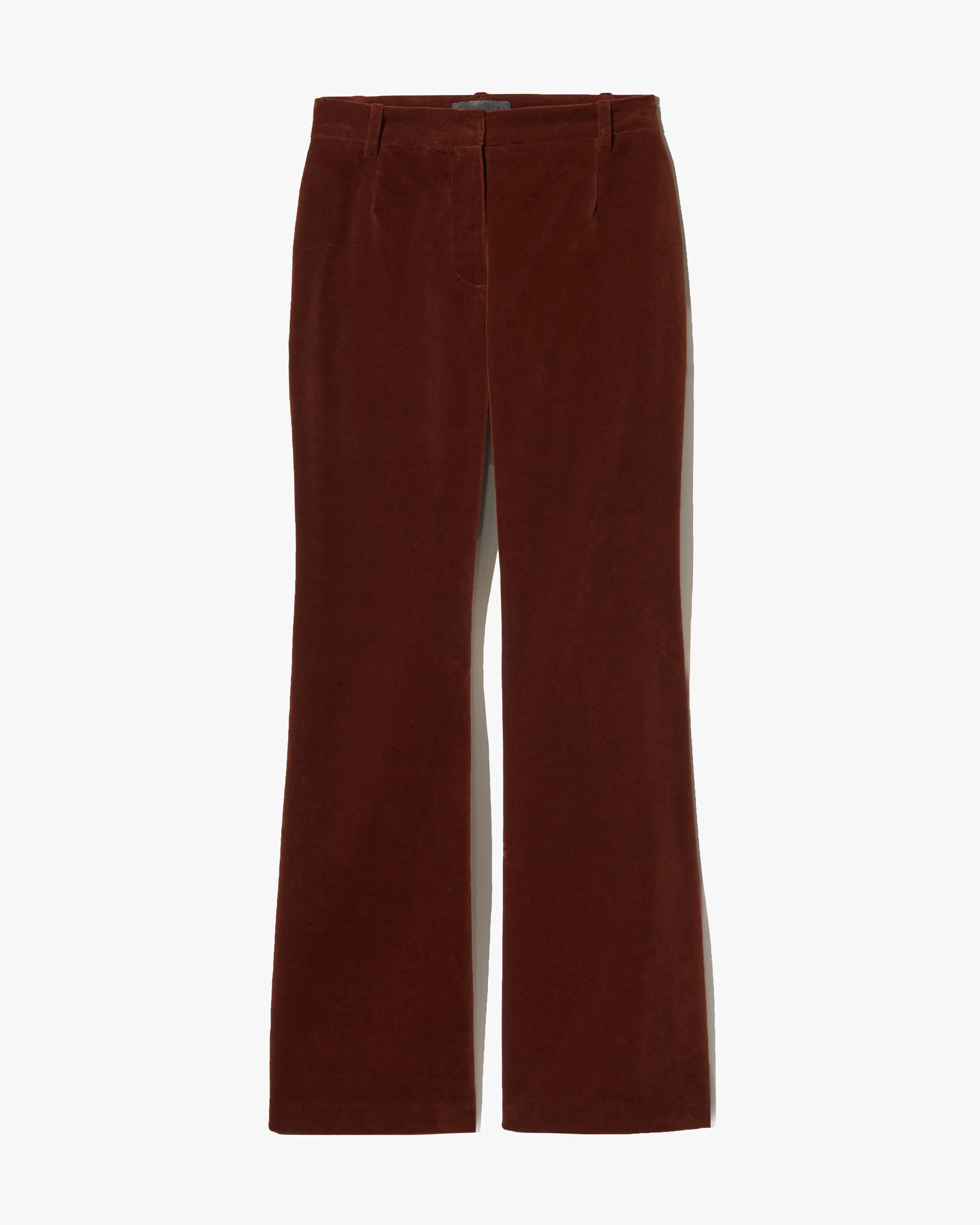 Flat front, high-rise straight leg trouser. Fitted through hips. Zip fly. Hidden hook-and-bar closure. Hidden stay button closure. Belt loops. Back welt pockets. Designed for a 35" inseam. - Made in USA - 98% Cotton 2% Elastane - Dry clean only - Low iron