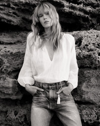Relaxed blouse in Indian washed ramie. Tonal Indian embroidery detail. Tassel tie detail. Shirring along neckline. COMPOSITION & CARE 100% Ramie Dry clean only Low iron