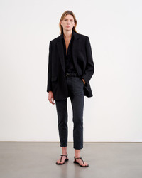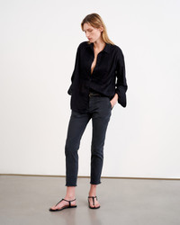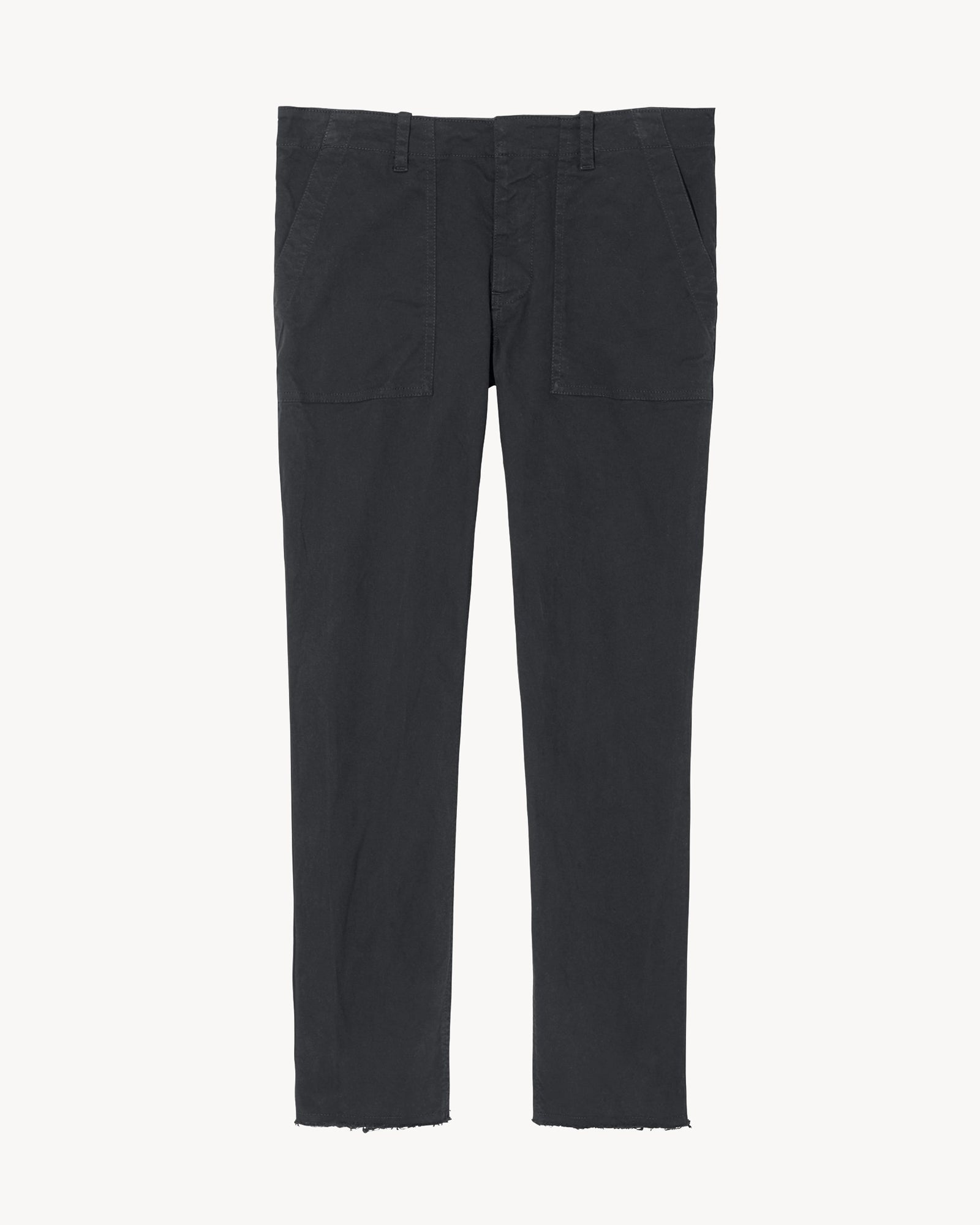 Flat front low waist slim angle length pant. Raw hem. Patch front pockets. Flap back pockets. Made in USA SIZE & FIT Model is 5'11 and wears a size 4. Waist allows for more stretch while calf and thigh are designed for a slim fit. For exact measurements by size, view our size guide. COMPOSITION & CARE 98% COTTON, 2% ELASTANE DO NOT BLEACH MACHINE WASH COLD TUMBLE DRY LOW LOW IRON