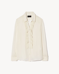 Long sleeve collared button up shirt in silk double georgette. Straight, slim body. Ruffle detail at center front. Pleated sleeve placket. Made in USA COMPOSITION & CARE 100% SILK DRY CLEAN ONLY LOW IRON