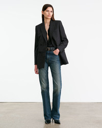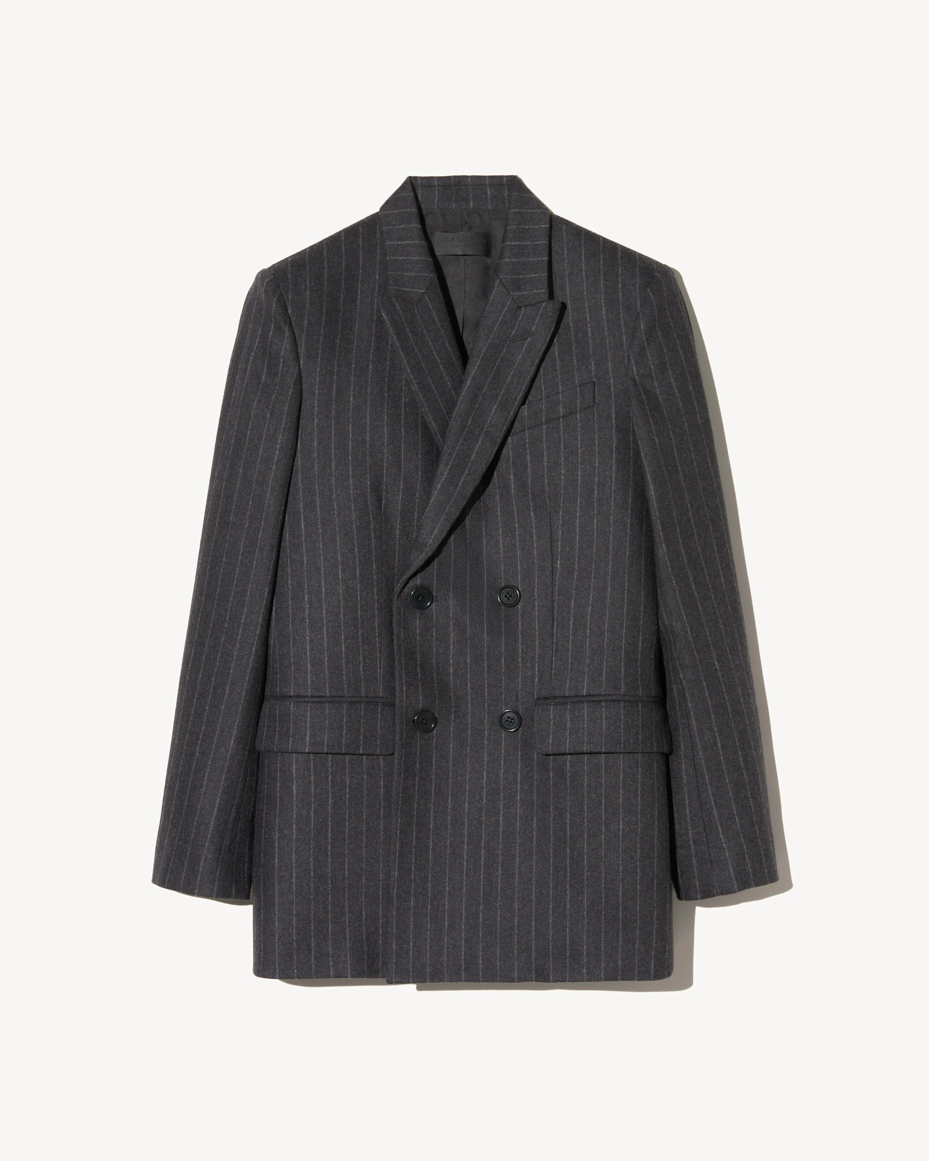 Double-breasted blazer. Long, slim body. Shoulder pads and dart detail at front for shape. Chest pocket and functional flap pockets. Button detail at lapel. Horn buttons at front and cuffs. Double back vent. Fully lined. - 90% Wool 8% Cashmere 2% Elastane - Dry clean only - Do not bleach - Low iron