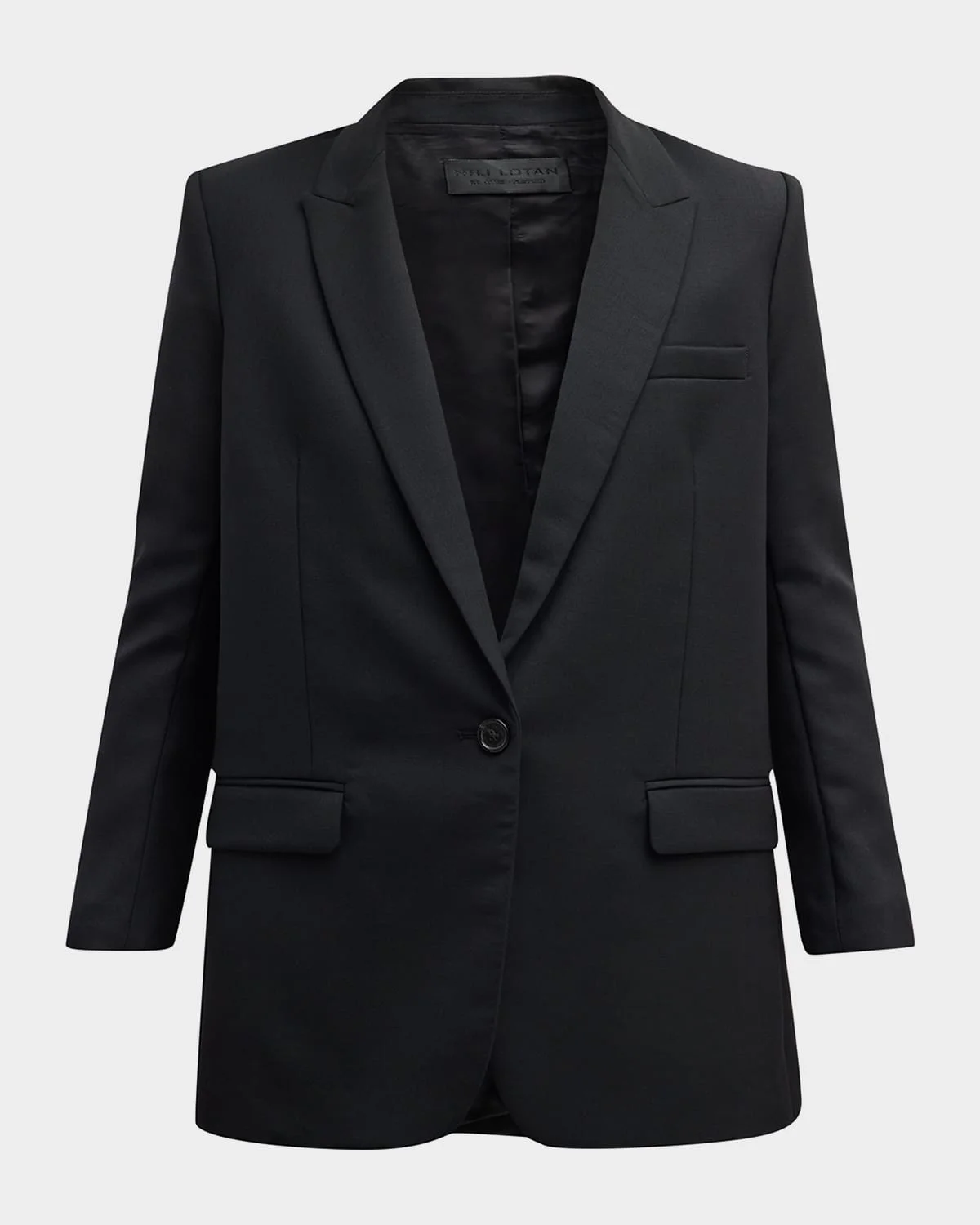 Nili Lotan "Diane" blazer jacket Peak lapels; singlebreasted front Long sleeves; button cuffs Chest welt pockets; side flap pockets Tailored fit Centerback vented hem Virgin wool/elastane Dry clean Made in USA