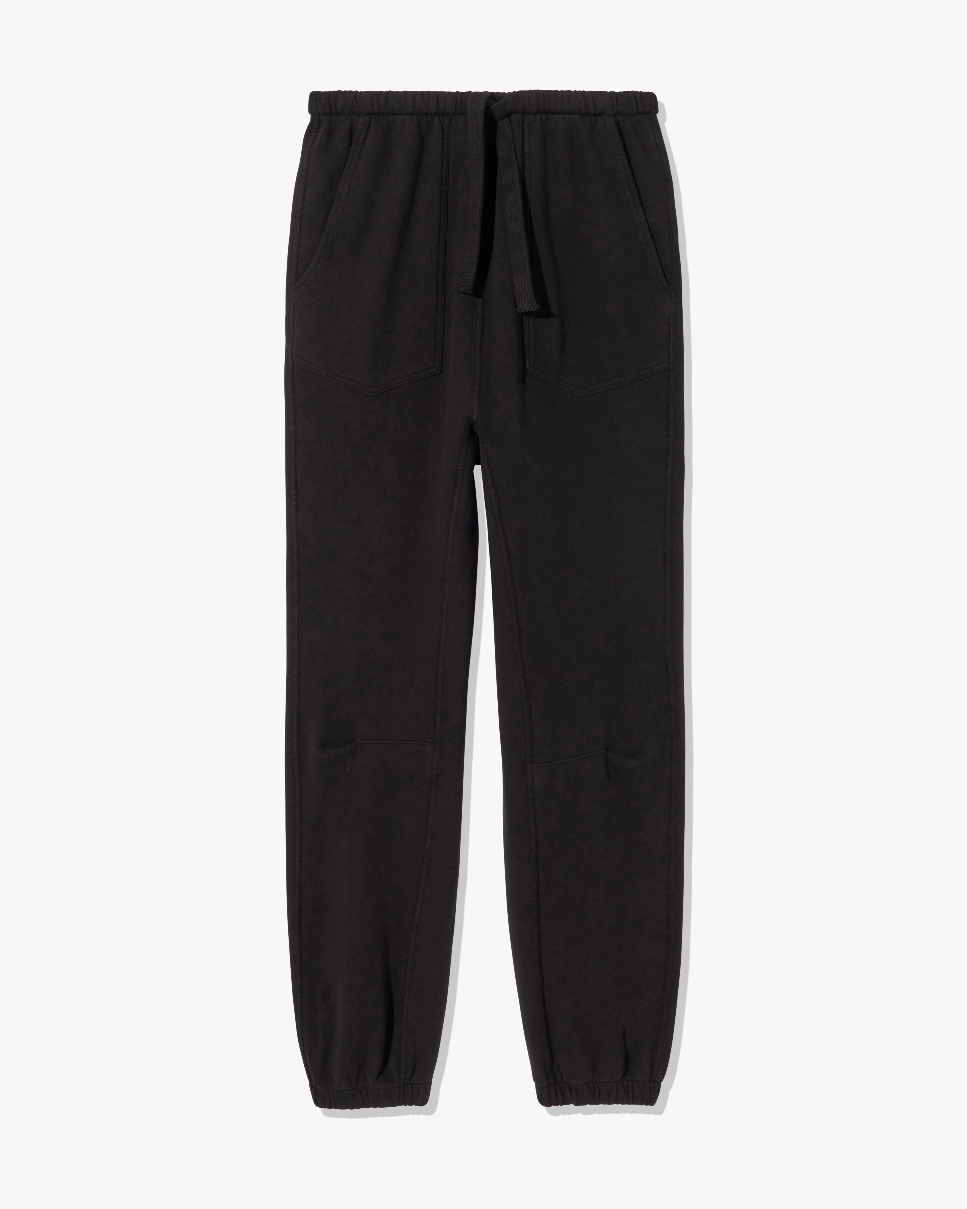 Mid-rise, relaxed sweatpant in American lightweight french terry cotton and polyester blend. Uniquely curved silhouette. Top-stitched patch pockets. Pleated seam detail at knees. Gusset at inseam. Dropped crotch. Elastic waistband with drawcord. Designed for a 24.5" inseam—tailor for a personalized fit. Made in USA COMPOSITION & CARE 100% Cotton Machine wash cold Do not bleach Tumble dry low Low iron Dry clean recommended