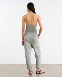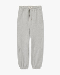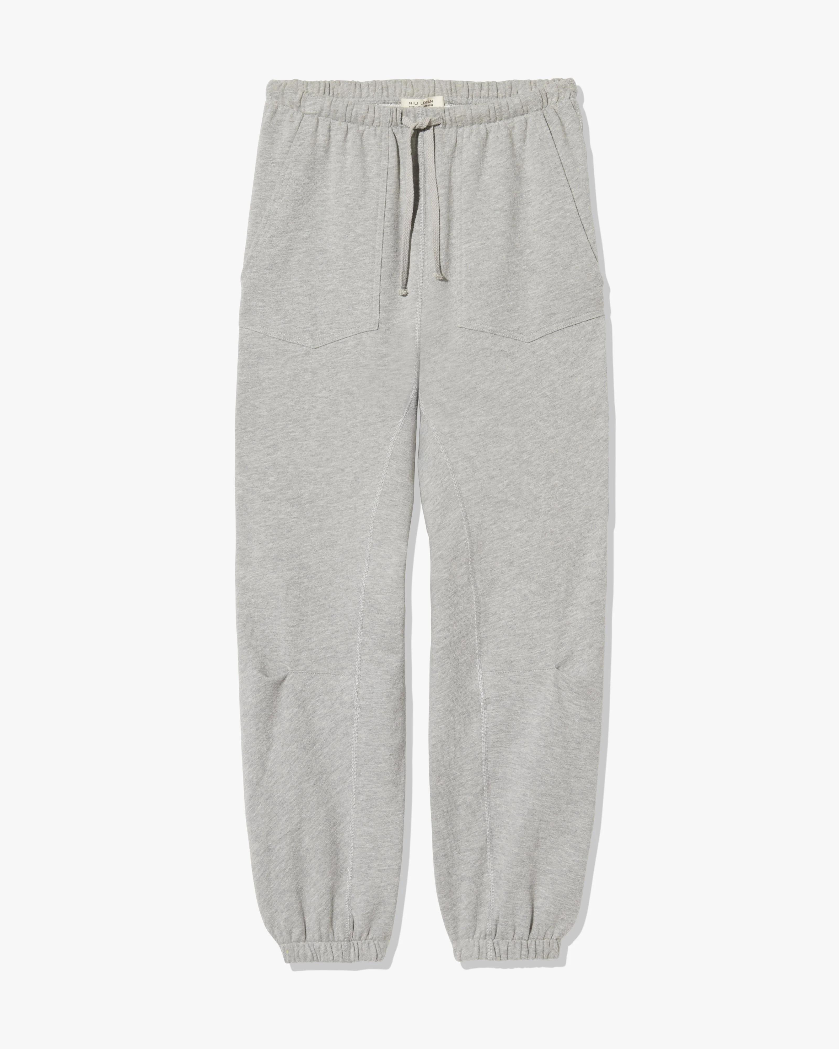 Mid-rise, relaxed sweatpant in American lightweight french terry cotton and polyester blend. Uniquely curved silhouette. Top-stitched patch pockets. Pleated seam detail at knees. Gusset at inseam. Dropped crotch. Elastic waistband with drawcord. Designed for a 24.5" inseam—tailor for a personalized fit. Made in USA COMPOSITION & CARE 93% Cotton, 7%Polyester Machine wash cold Do not bleach Tumble dry low Low iron Dry clean recommended