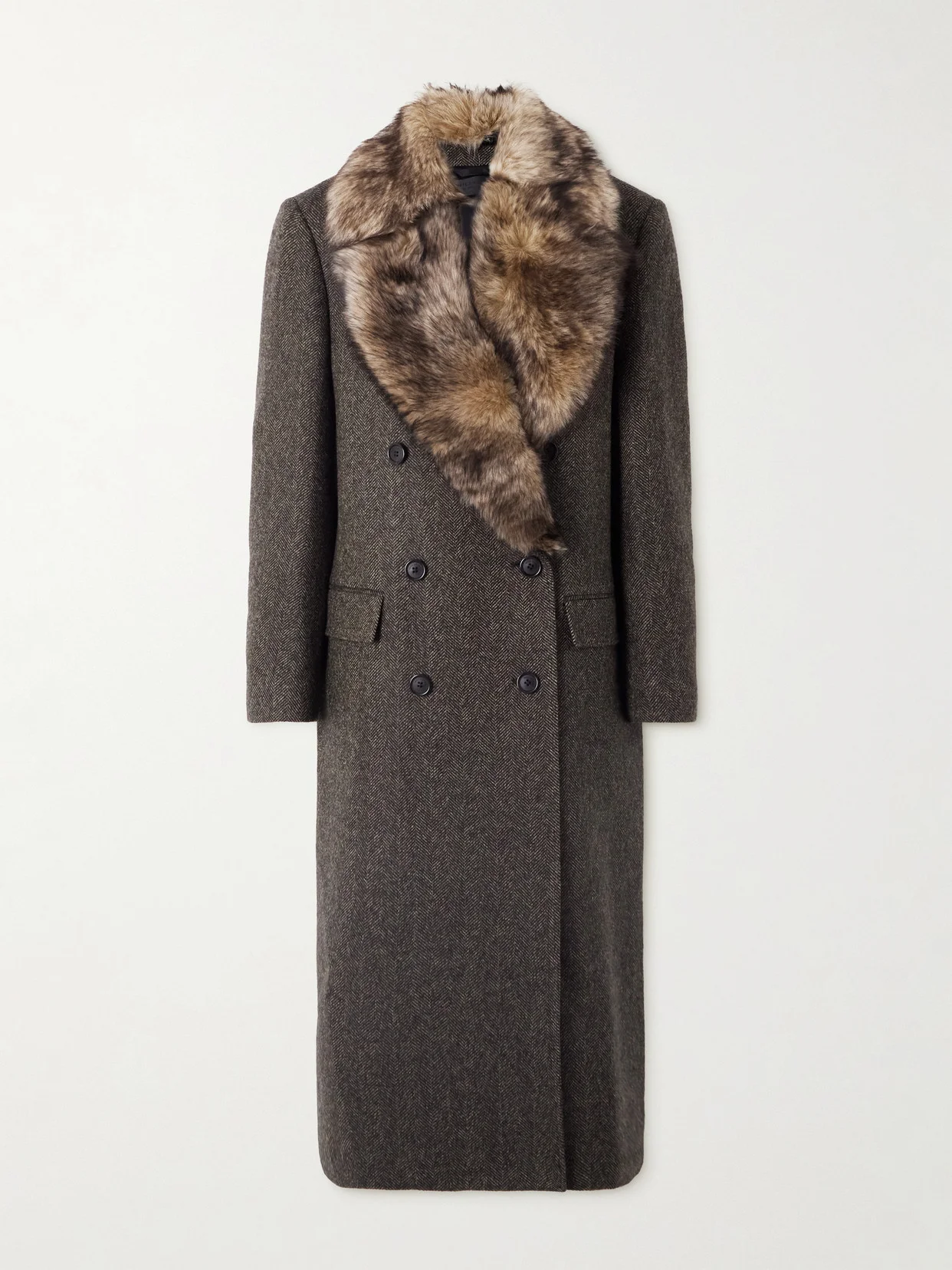 Edina Double-breasted Shearling-trimmed Herringbone Wool Coat