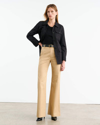Flat front, high-rise flare leg trouser in cotton. Fitted through hips. Zip fly. Hidden hook-and-bar closure. Hidden stay button closure. Belt loops. Back welt pockets. Designed for a 35" inseam—tailor for a personalized fit. Made in USA COMPOSITION & CARE 100% COTTON Dry clean only Low iron