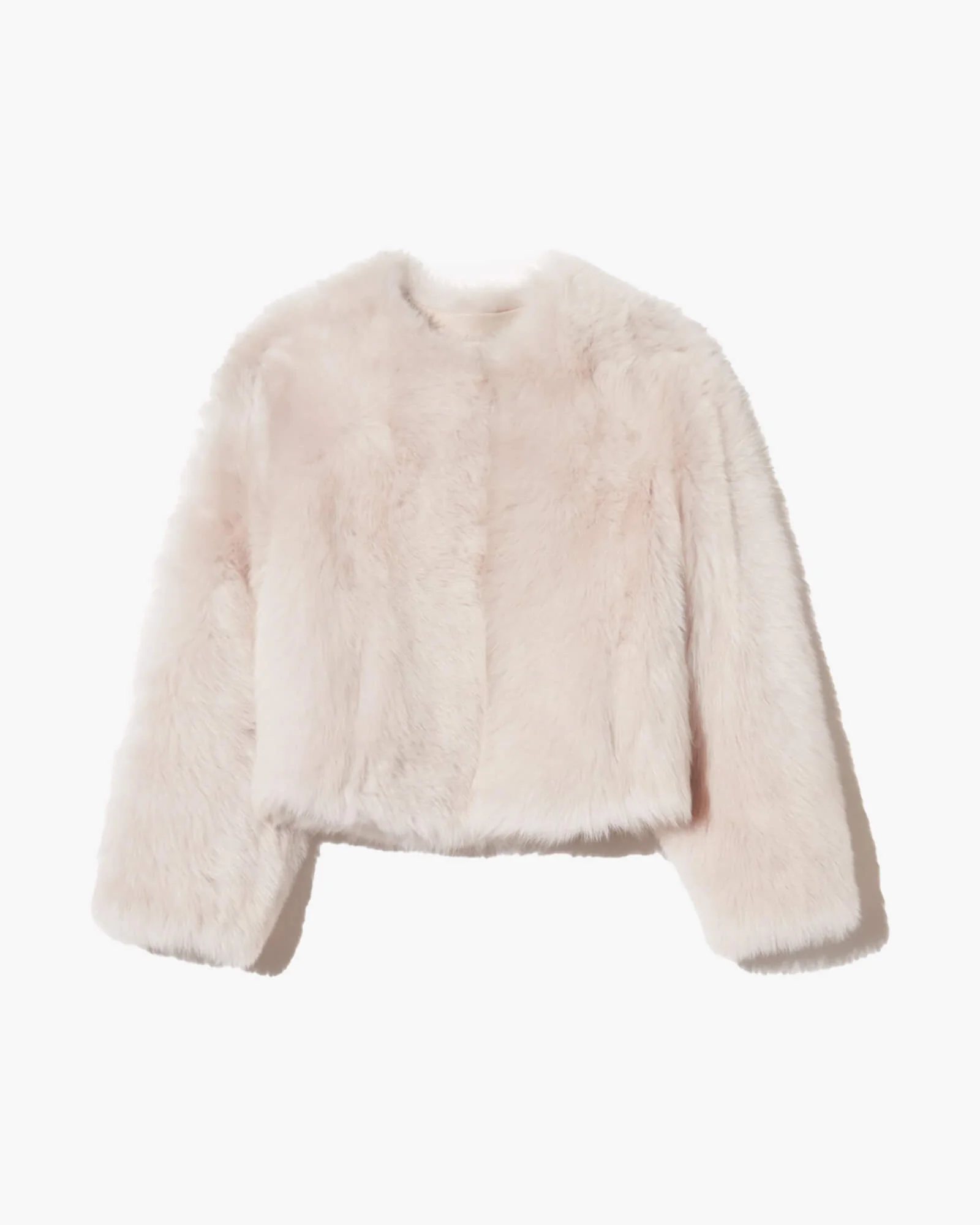 Short-body shearling jacket. Collarless design with relaxed shoulders. Side seam pockets. Fur hook closure. Fully lined with leather facing.